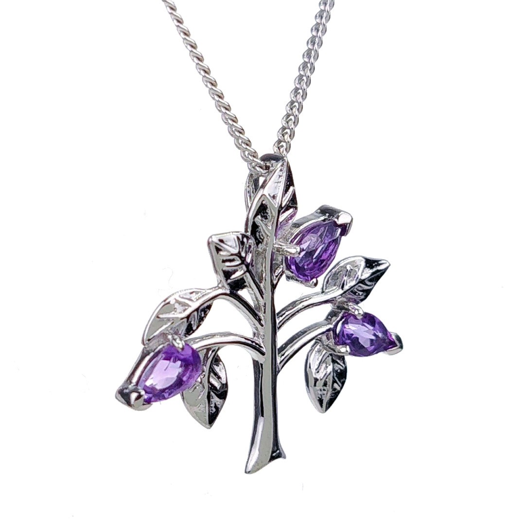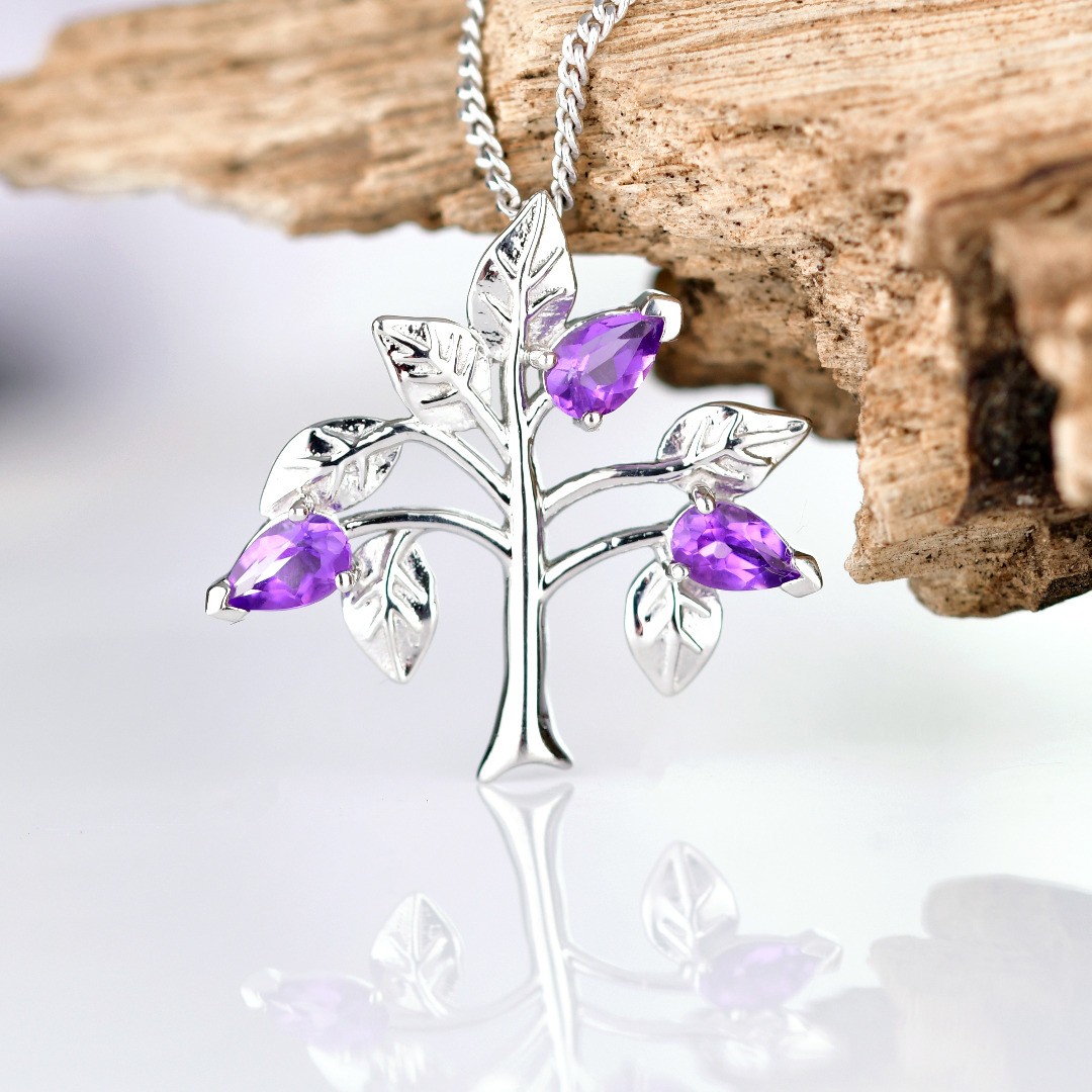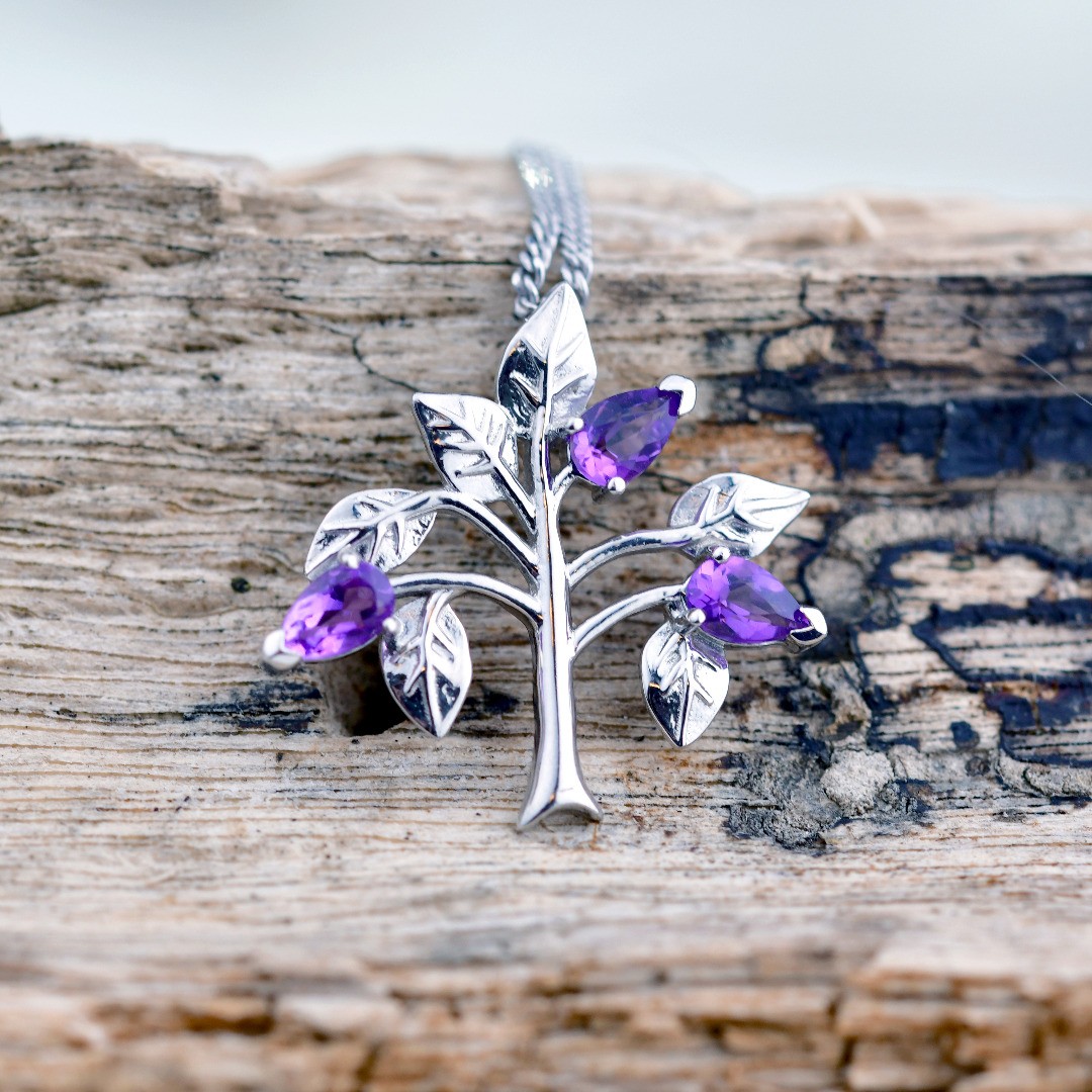 Natural Amethyst Necklace Sterling Silver Purple Gemstone Tree of Life Handmade