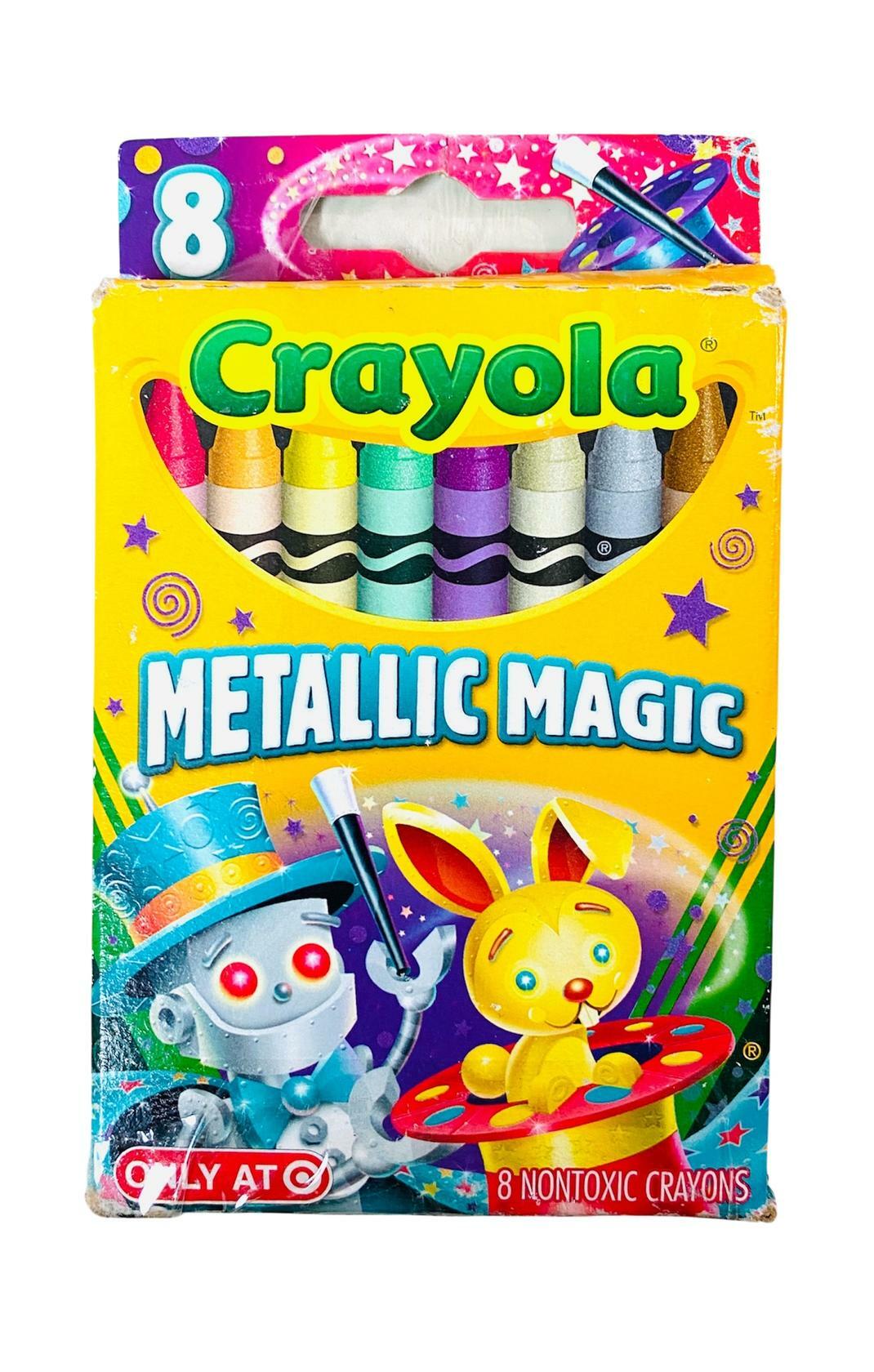 Crayola 8 count crayons metallic magic. Shiny colors for dazzling metallic designs. Each box of Crayola Pick- Your- Pack Crayons is color-coordinated to take your imagination on an adventure! Collect your favorite themes into a cool designer box and let creativity run wild!