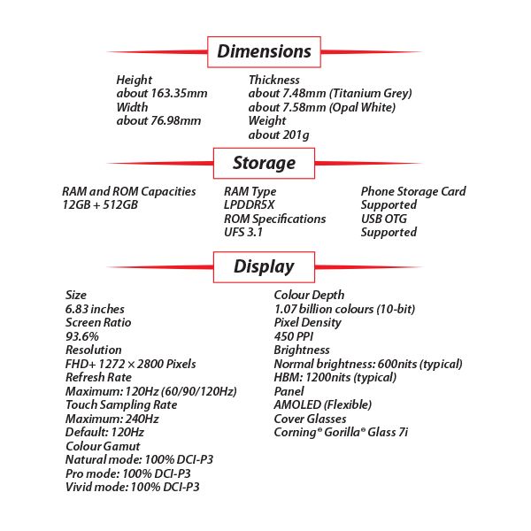 (Opal White), 7.48mm (Titanium Grey), and weight about 201g.