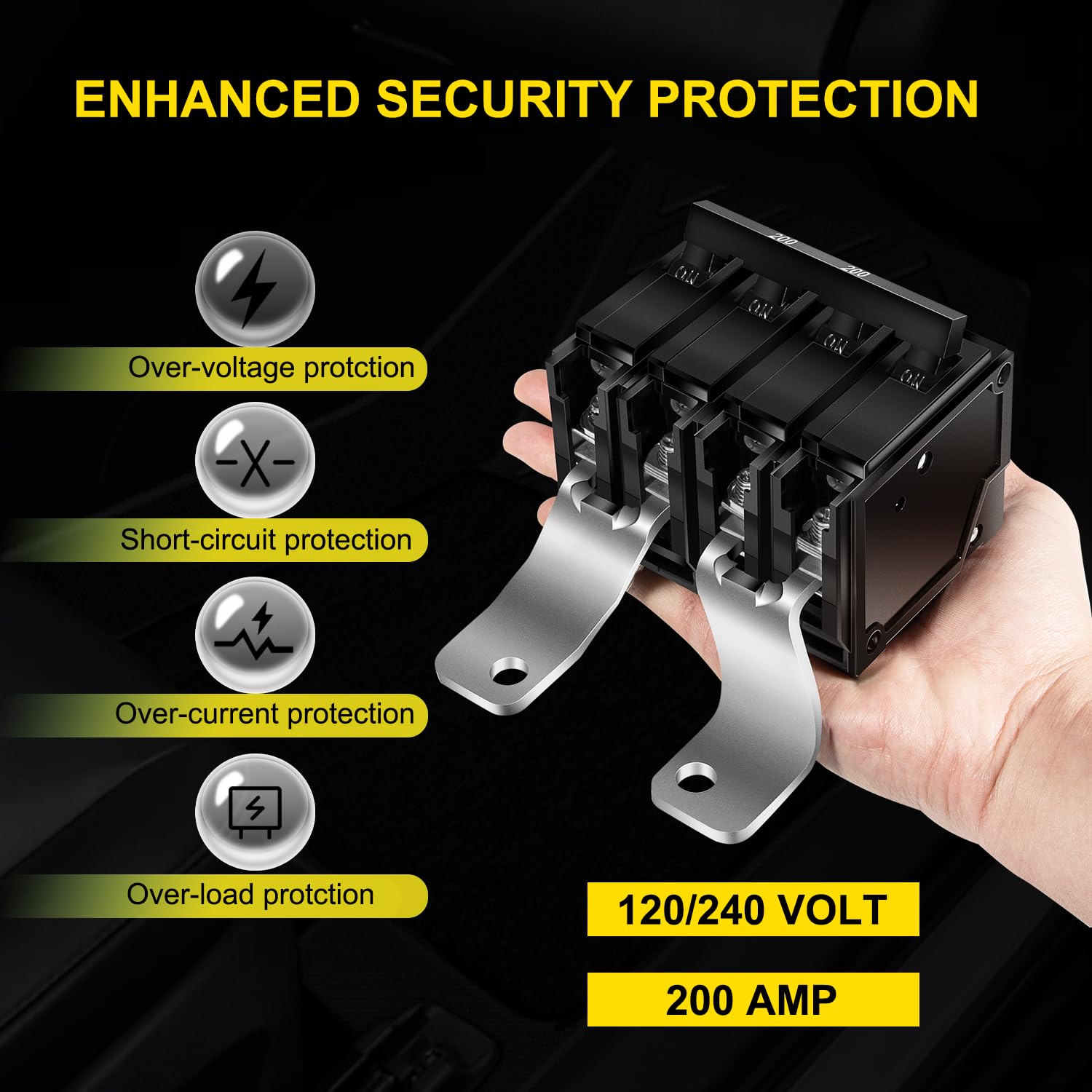 Current Rating: 200 Amp capacity, designed for high-load electrical systems. Voltage Compatibility: 240 Volt operation, suitable for residential and commercial power distribution. Pole Configuration: 2-pole design for split-phase circuits.