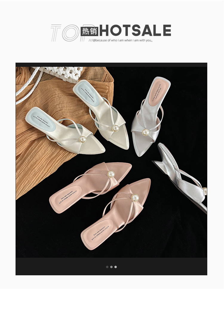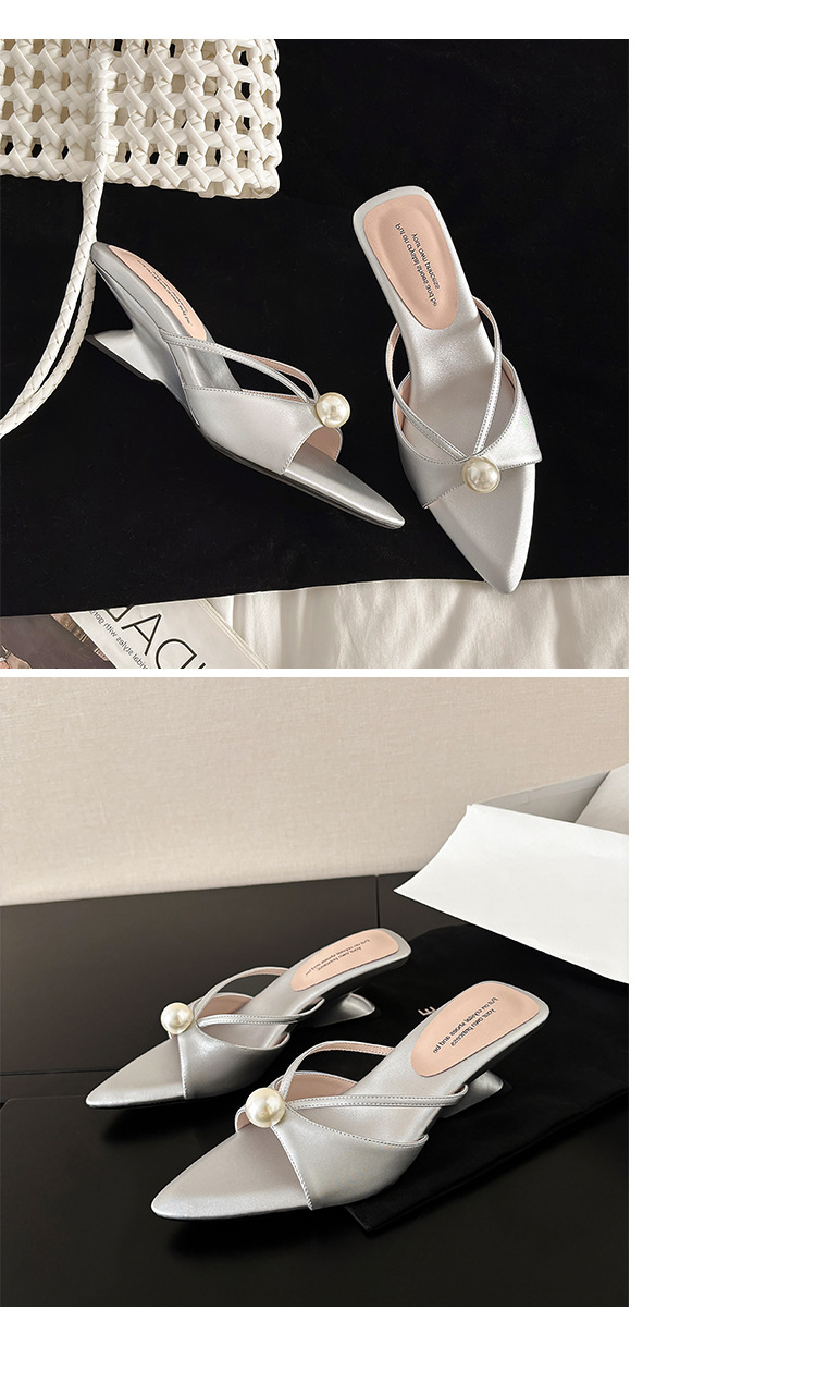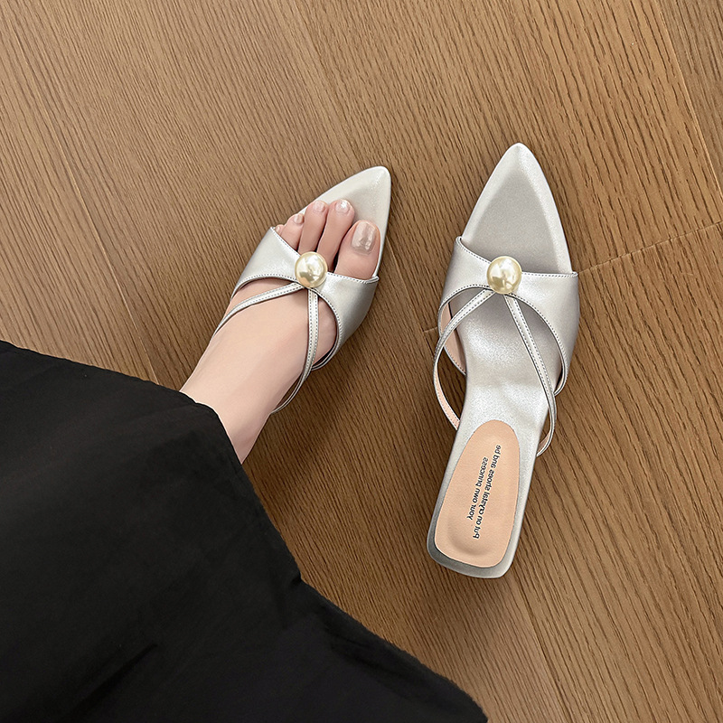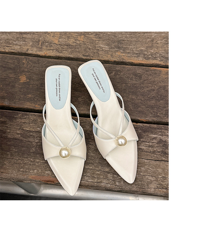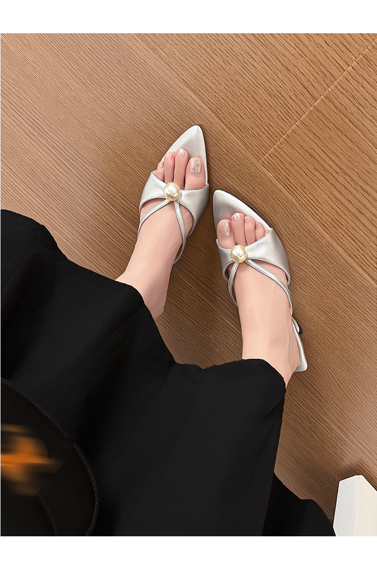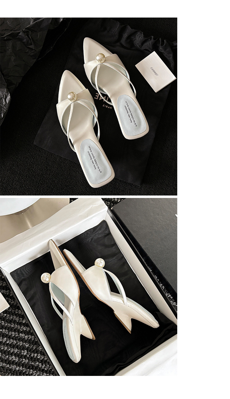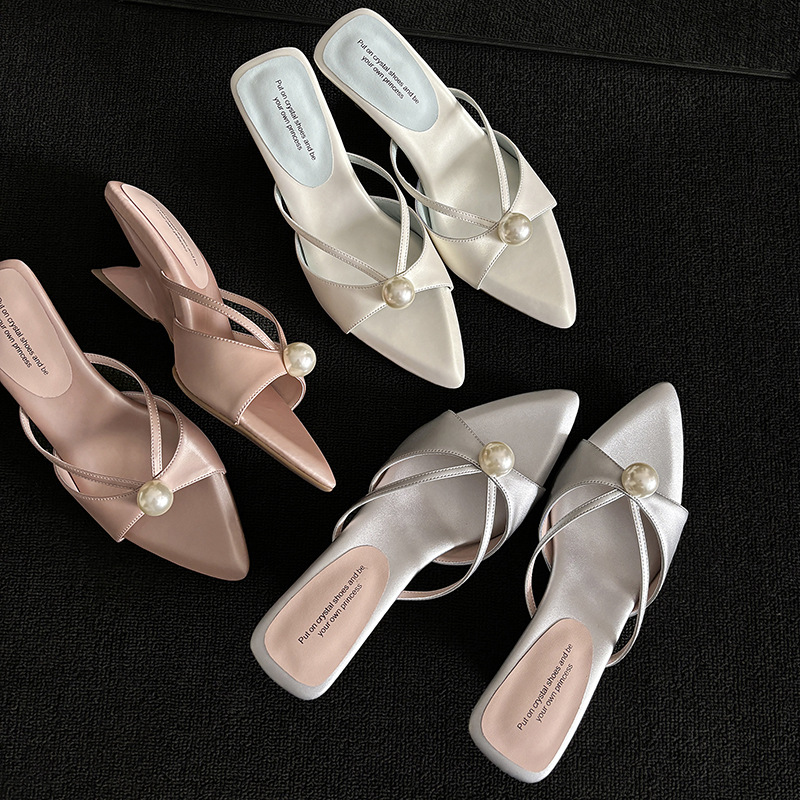 Womens New Pointed Toes High Heels Pearl Sandals Thick Heels Middle Heels Shoes