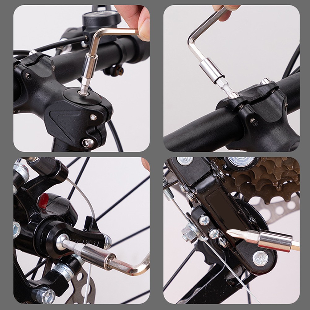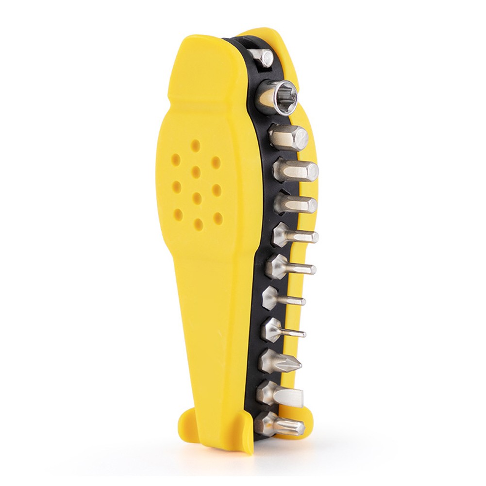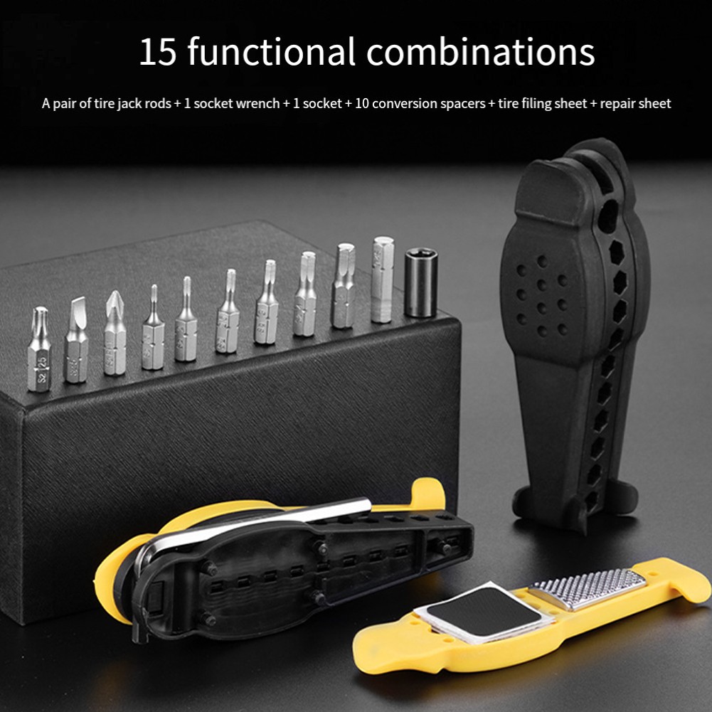 15 functional combinations: a pair of tire levers + 1 socket wrench + 1 socket + 10 conversion bits + tire file + tire patch.