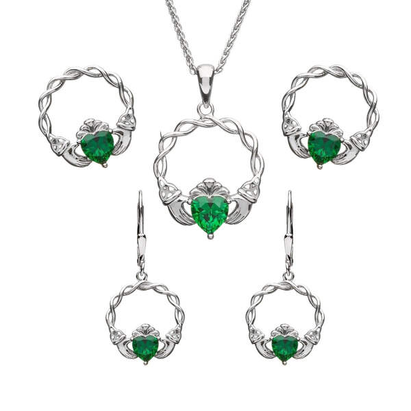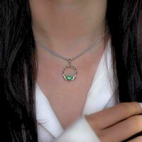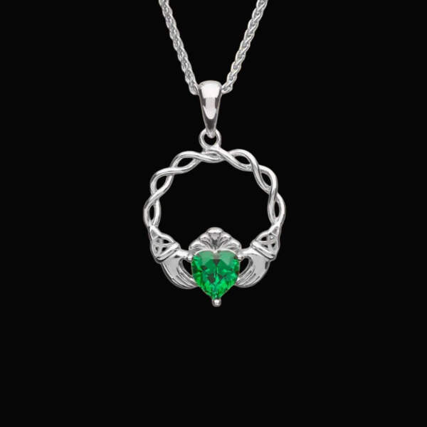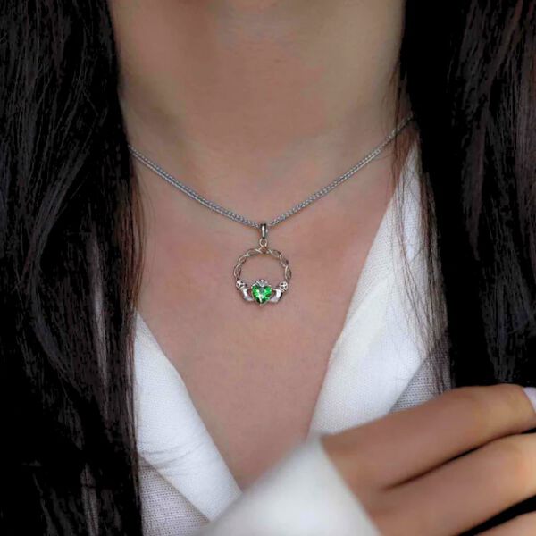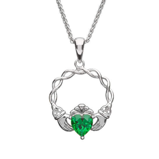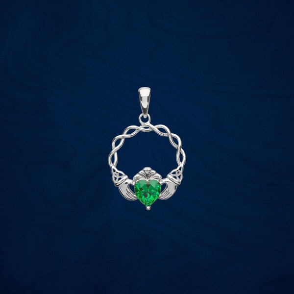 This sterling silver Boru Claddagh Necklace is a gorgeous take on a traditional Irish design. Made in Ireland, this necklace features beautiful, scrolling Celtic Knot-work across the arch connecting the hands of friendship, which hold a sparkling, green Cubic Zirconia heart of love. Finished with the classic crown of loyalty, this phenomenal necklace makes the perfect gift for any loved one or cherished friend.