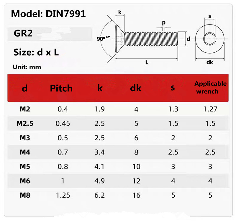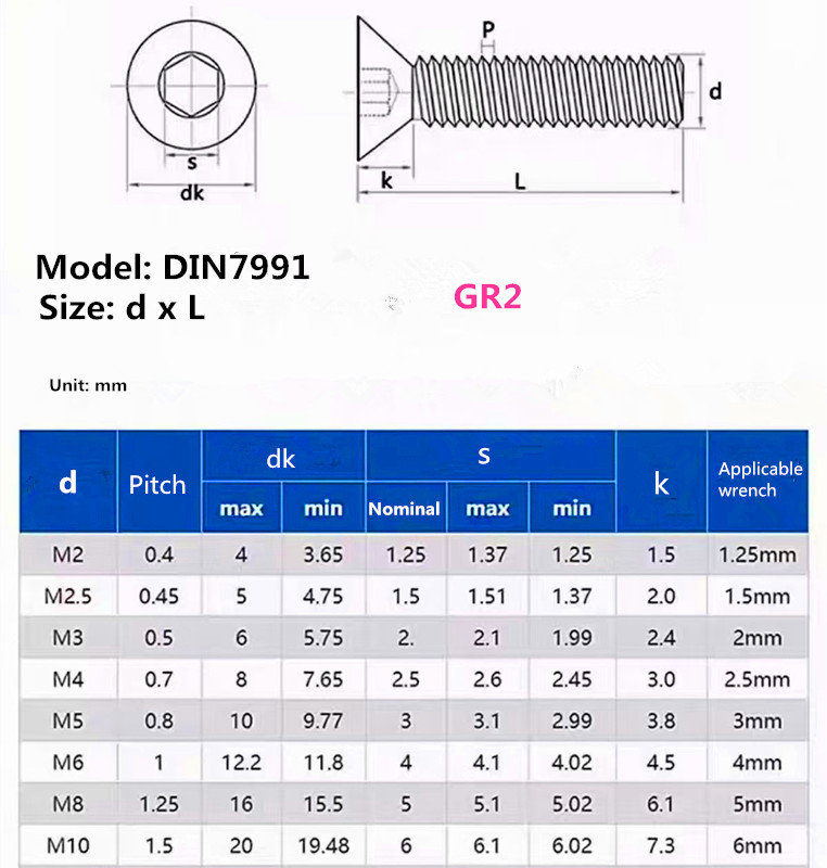 GR2 Titanium Hex Socket Bolt Countersunk Flat Head