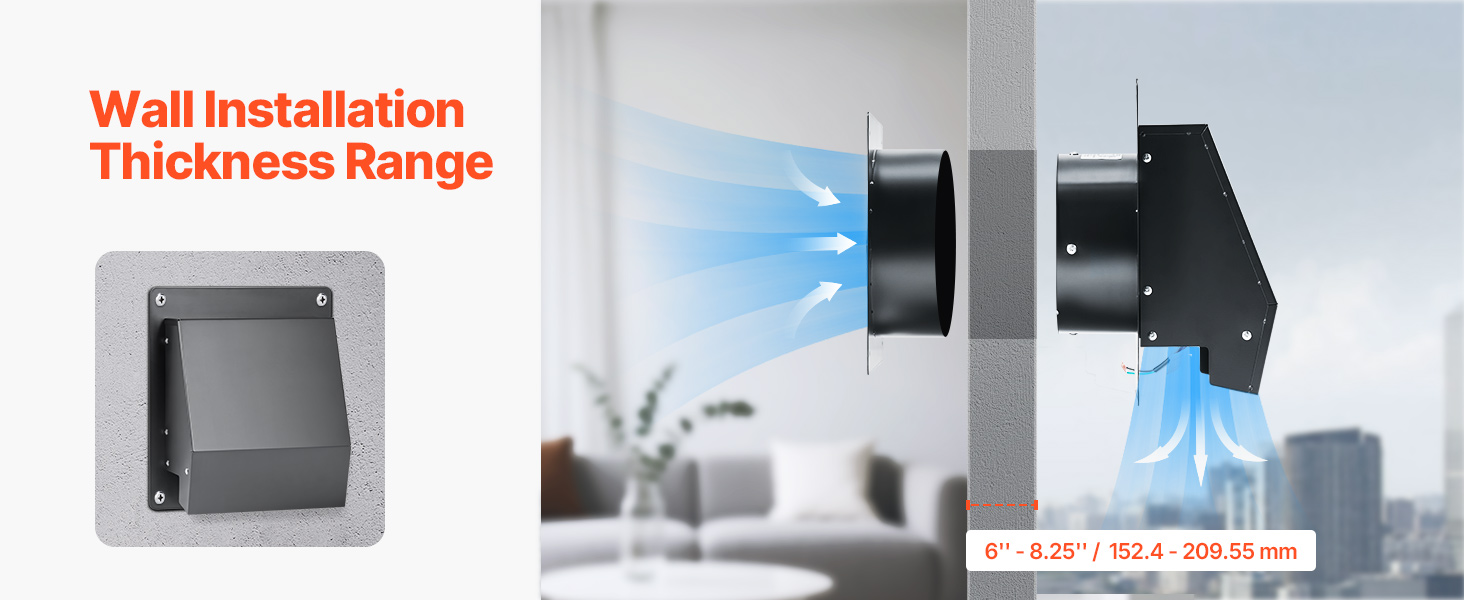 Compatible Installation Walls: The through-the-wall ventilation fan is compatible with wall thicknesses ranging from 6in to 8.25in, making it suitable for installation between the walls of your bathroom, garage, laundry, storage room,and more
