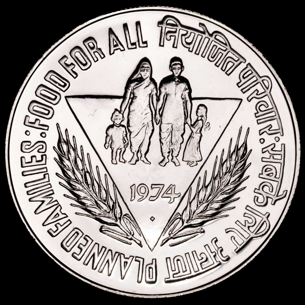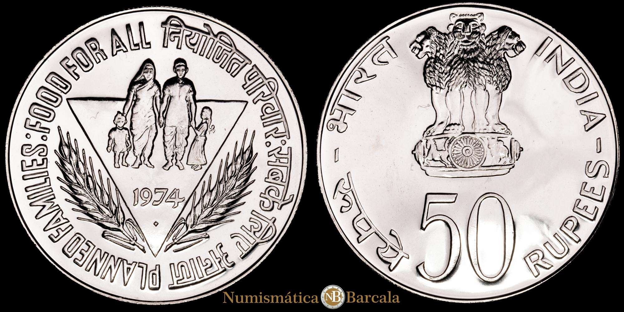 India, 50 rupias, 1974, Bombay, 34.831 g, Ag (500/1000), KM# 255, FAO - Familias Planificadas;