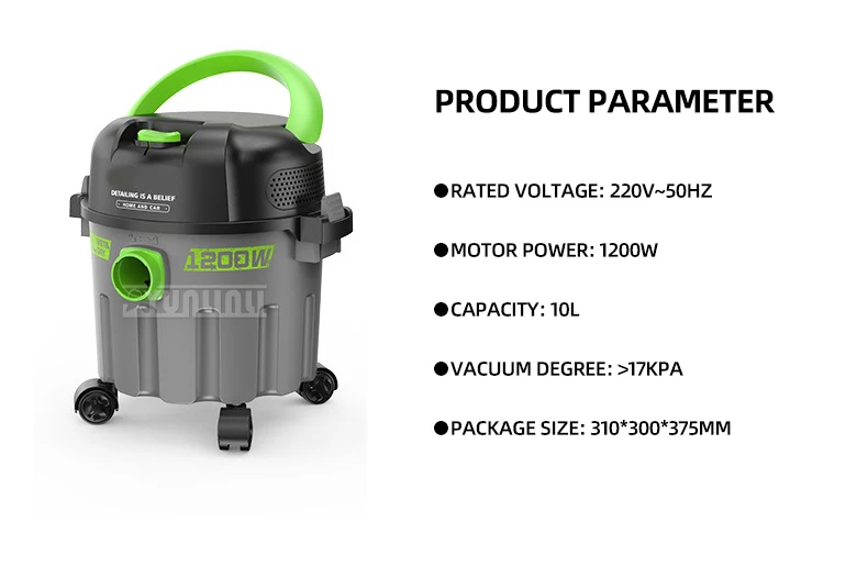 Household High Suction Vacuum Cleaner 10L Powerful Vacuum Cleaner 1200W Product parameters Rated voltage 220V~50Hz Motor power 1200W Capacity 10L Vacuum>17KPa Package size 310*300*375mm Weight: 6kg