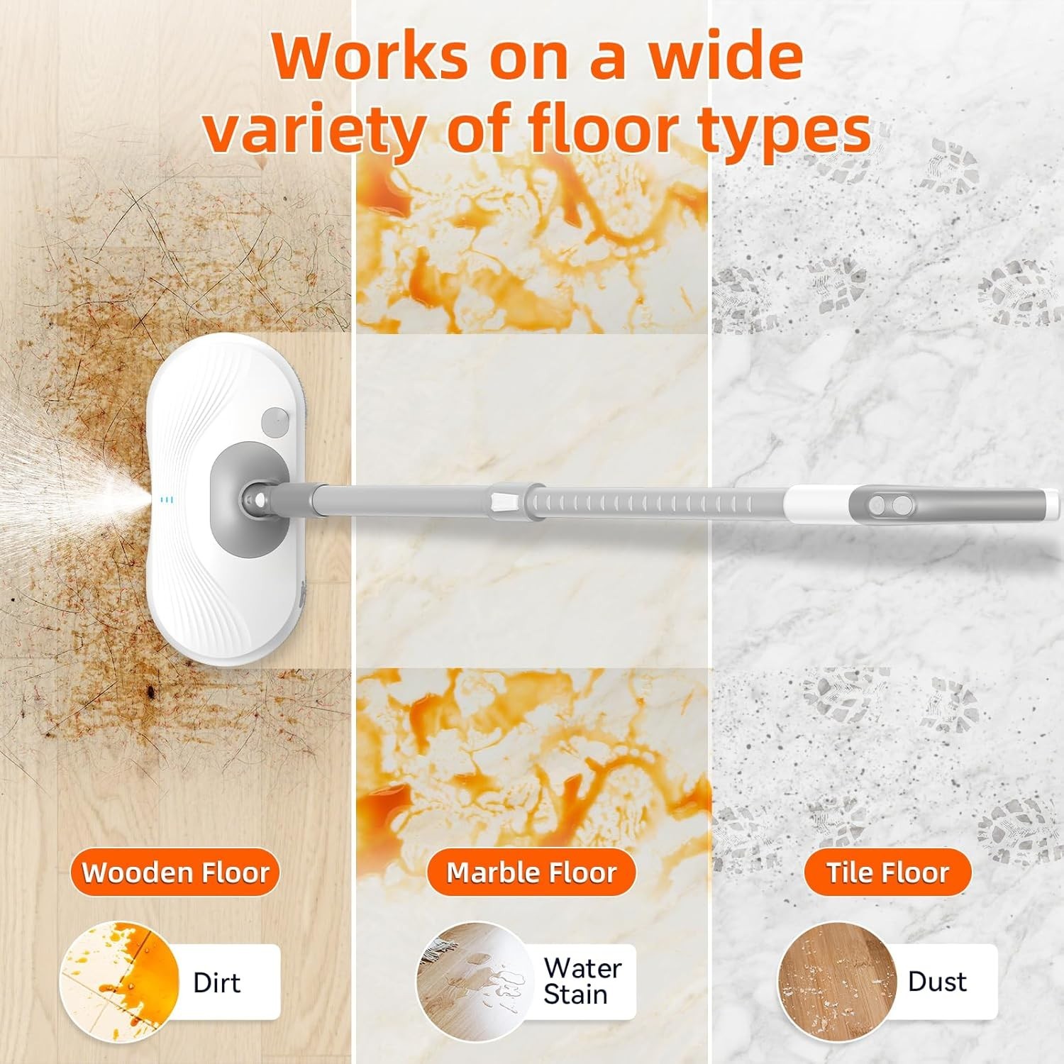 Trigger Spray & Instant Dry Mode: Effortlessly zap tough stains with a burst of water; switch between wet and dry mopping for versatile cleaning on any floor type.