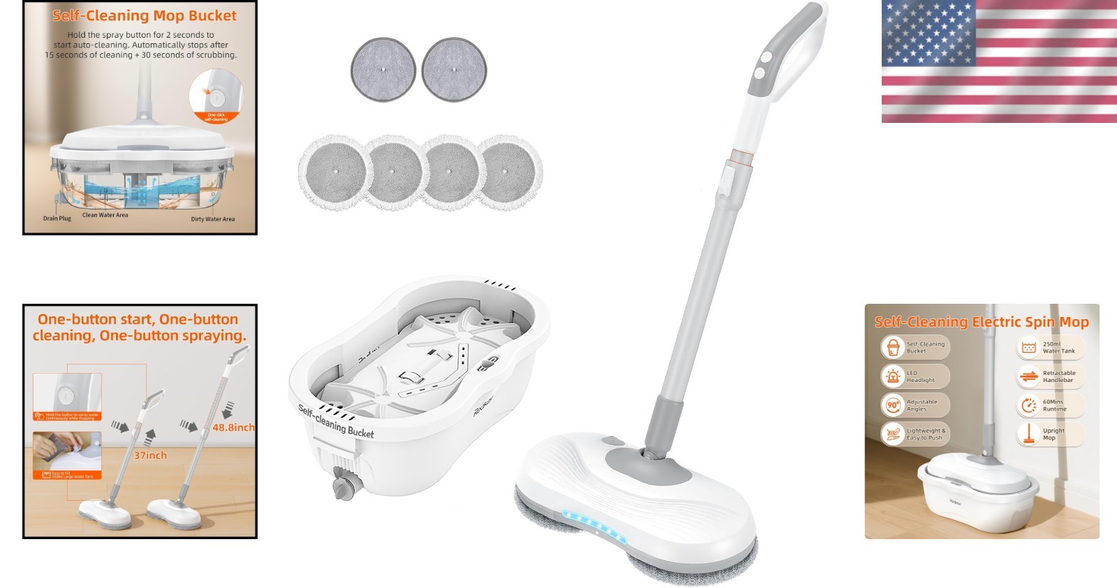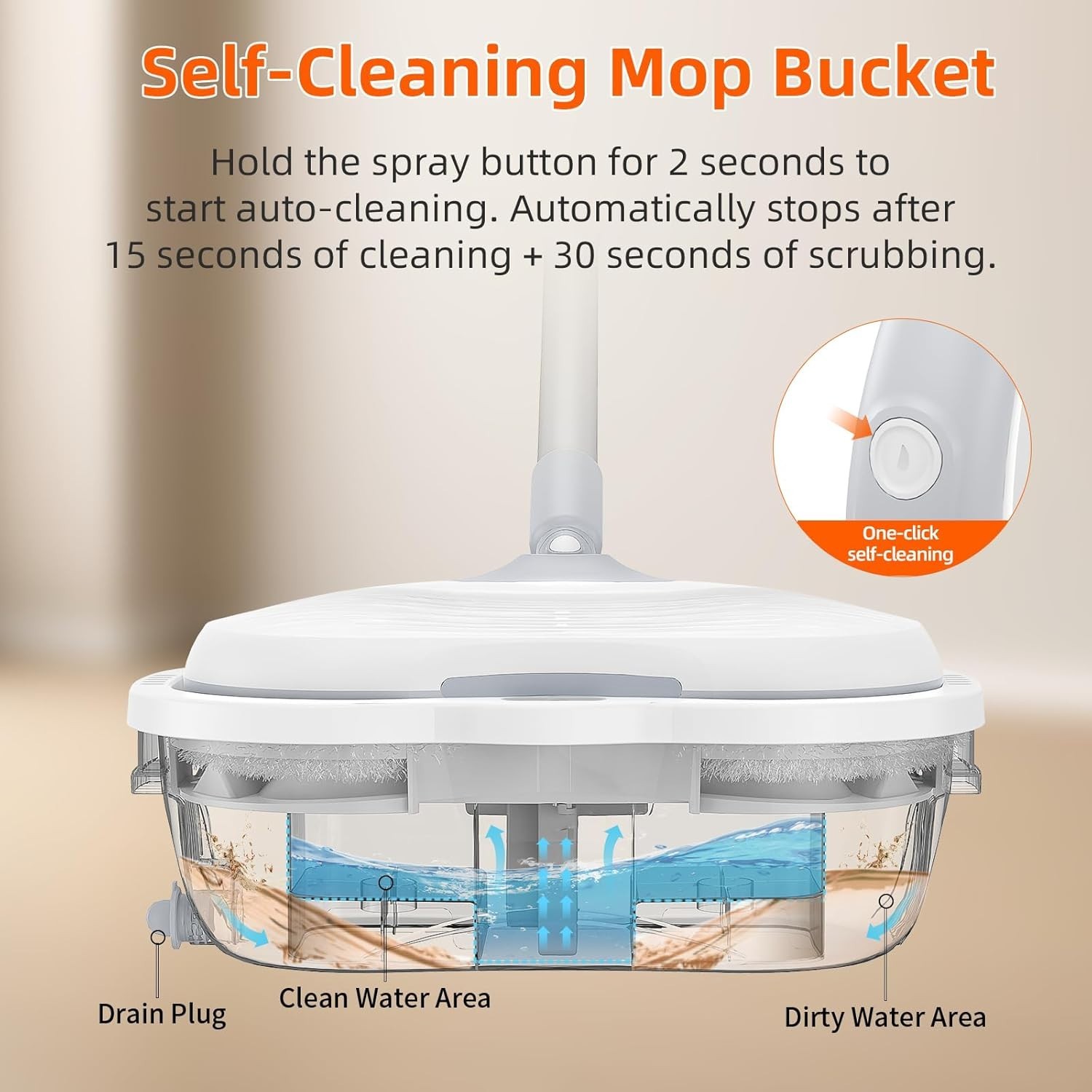 Self-Cleaning Bucket & Large 250ml Tank: The innovative self-cleaning bucket automatically cleans and spin-dries the mop without you touching it. The spacious 250ml water tank covers a large area of 1,700–2,200 sq.ft.