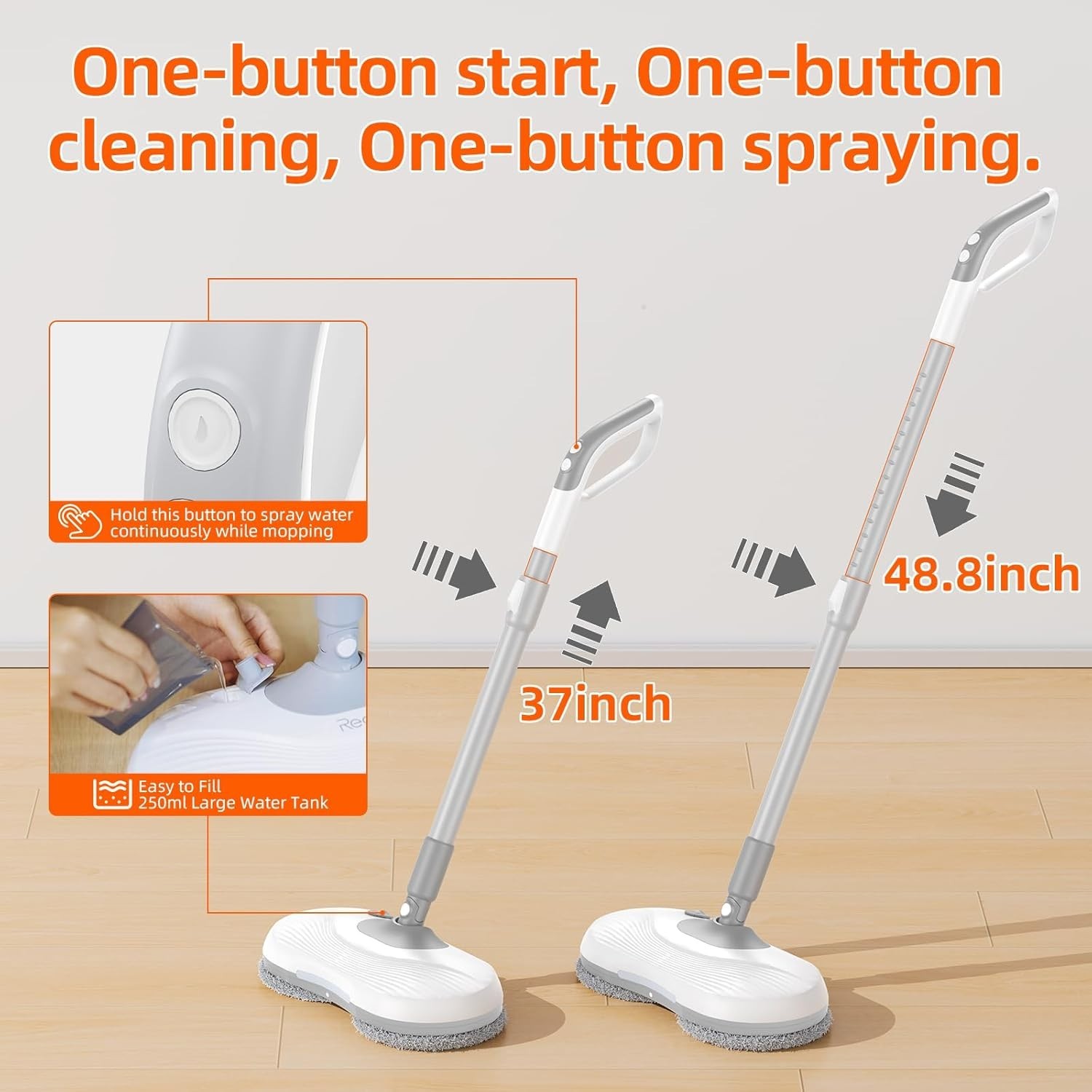 37-48.8" Telescopic Pole & 90° Swivel Arms: Customize your cleaning experience with adjustable height and angle to easily reach ceilings or clean under furniture without straining your back.