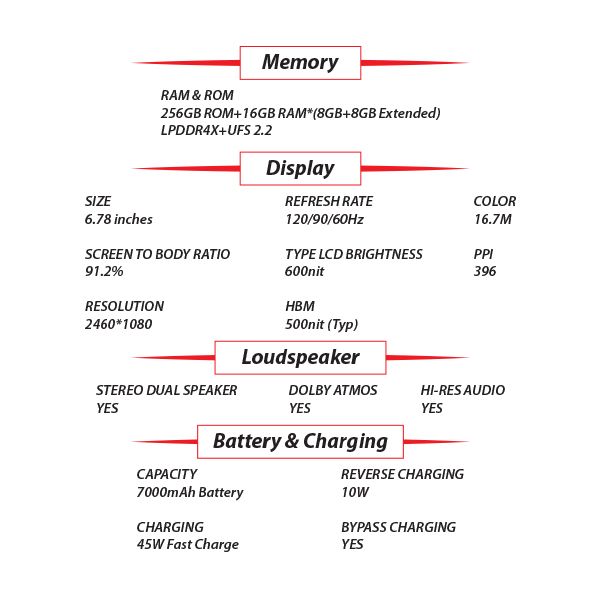 - 7000mAh Mega battery for All-Day use, 45WFlashCharge