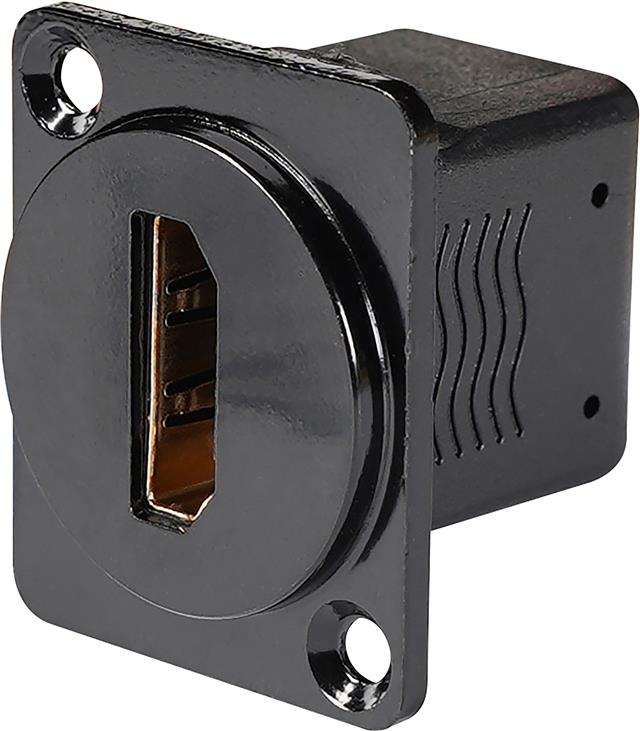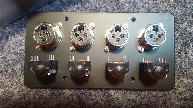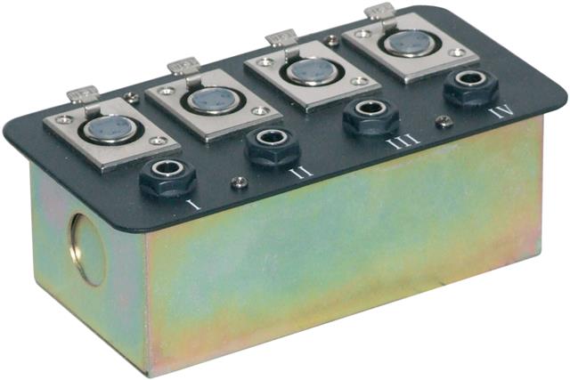 A metal AV wall plate featuring 4x XLR Sockets and 4x 6.35 mm Jack sockets.