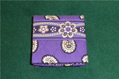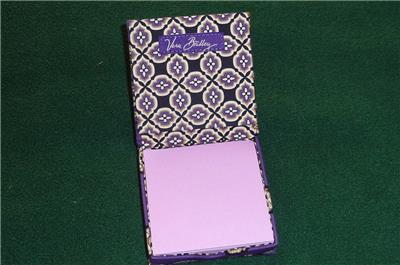 You are viewing a VERA BRADLEY Stickie note box holder. Comes in Simply Violet - retired Summer 2010. Purple/white/beige floral paisley pattern, fold-over container and lavender stickie paper pad inside.