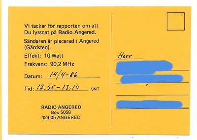 A good QSL-card from Swedish local station Radio Angered in Gothenburg, confirming report from Sweden on the 14th of April 1986. Name and address of DX-er not shown out of courtesy when card was scanned. No pinholes or bent corners. Good radio history.