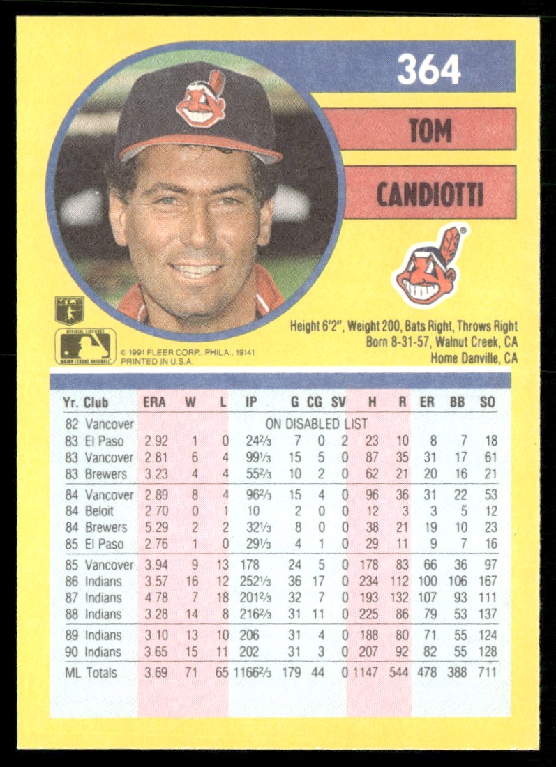 | 1991 FLEER TOM CANDIOTTI CLEVELAND INDIANS #364 |