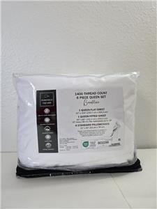 Set includes: flat sheet (92" x 104"), fitted sheet (60" x 80" + 15") and four pillowcases (21" x 30")