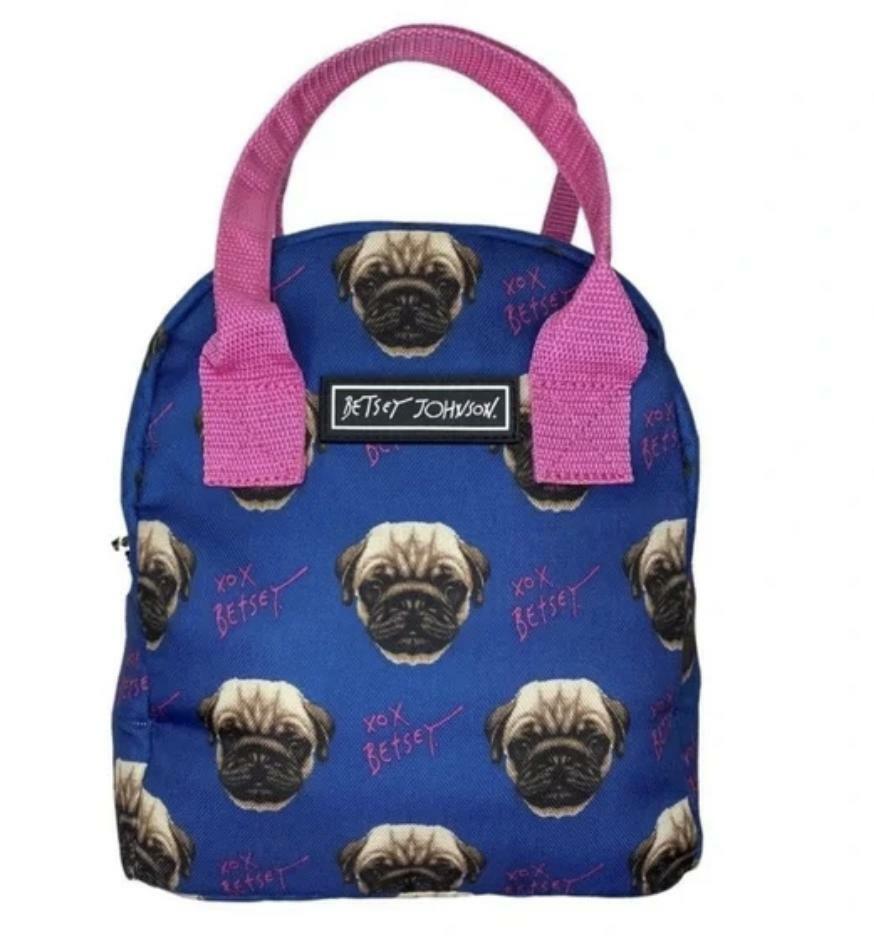 Betsey Johnson Pug Dog Navy/ Pink Insulated Lunch Tote Bag. Measures 9.5" x 8" x 5.5".