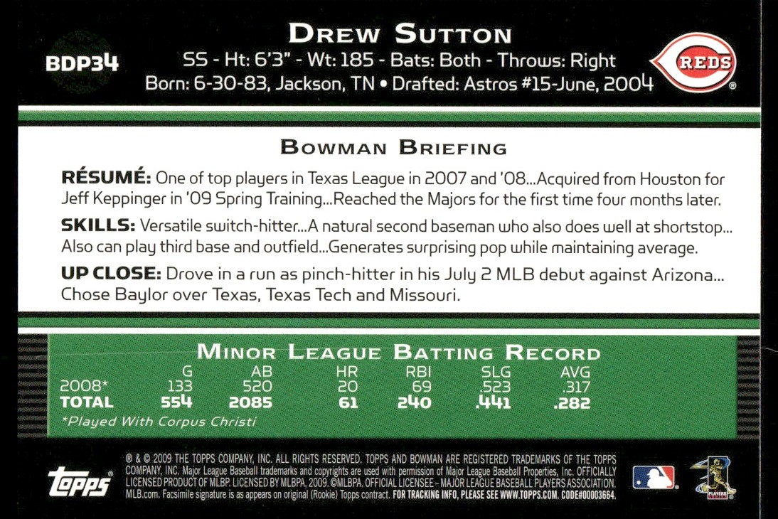 2009 Bowman Drew Sutton Rookie Cincinnati Reds #BDP34