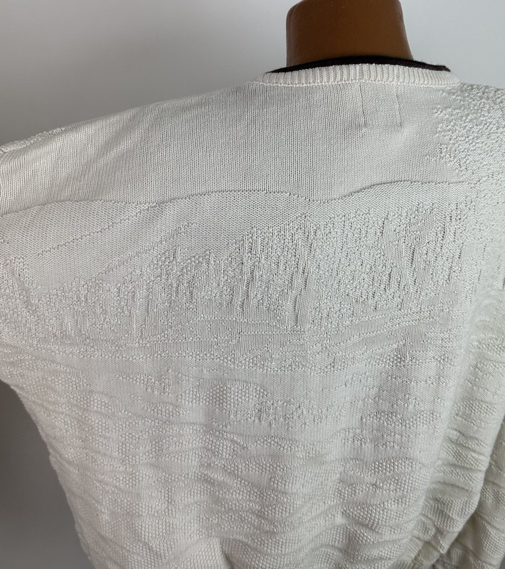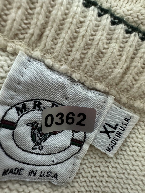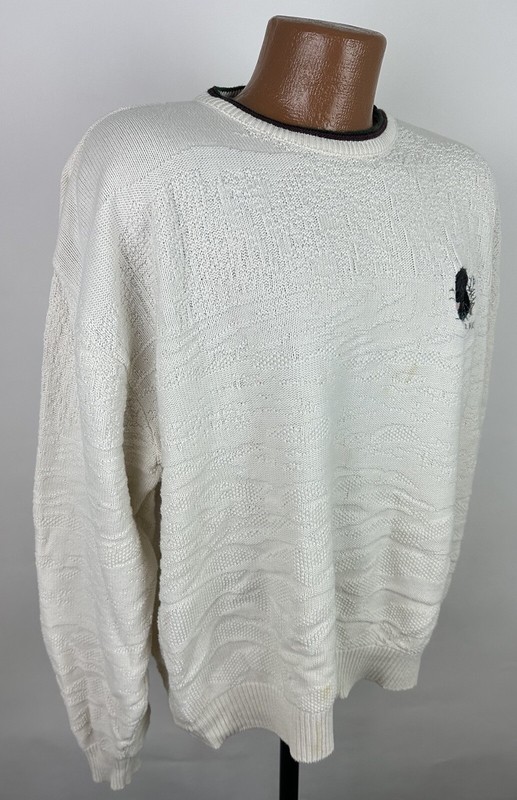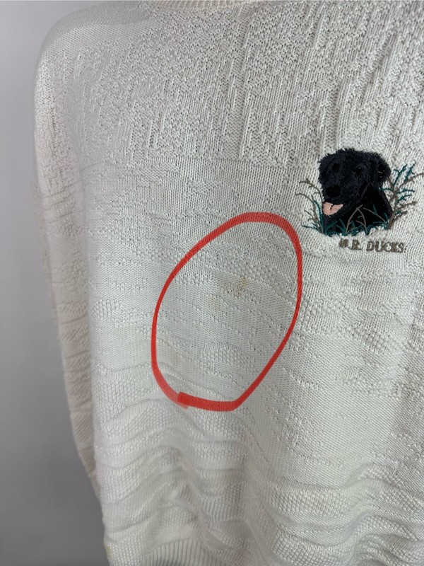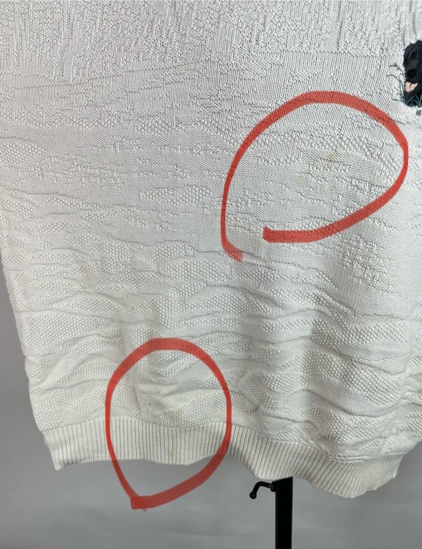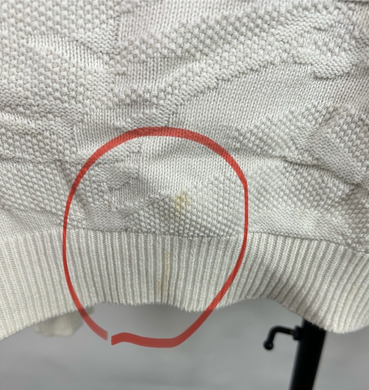 CONDITION: AS IS - stains at front chest, bottom hem and back sleeve hem - Item was washed but stains did not come out. Overall moderate general wear, fading, light pilling / fuzziness to knit. See pics for details. See measurements to ensure a proper fit.