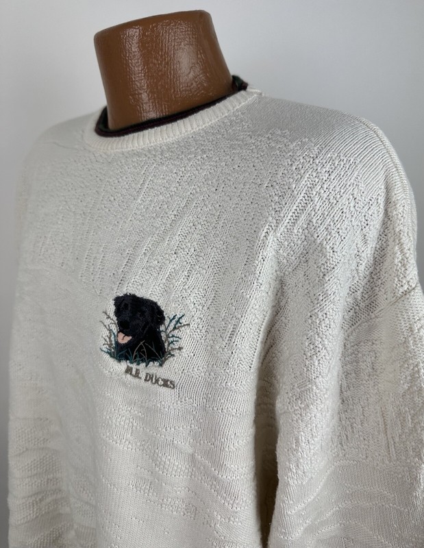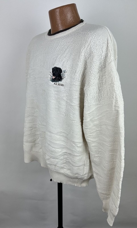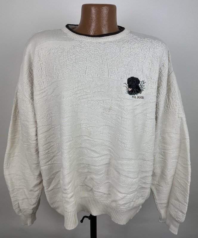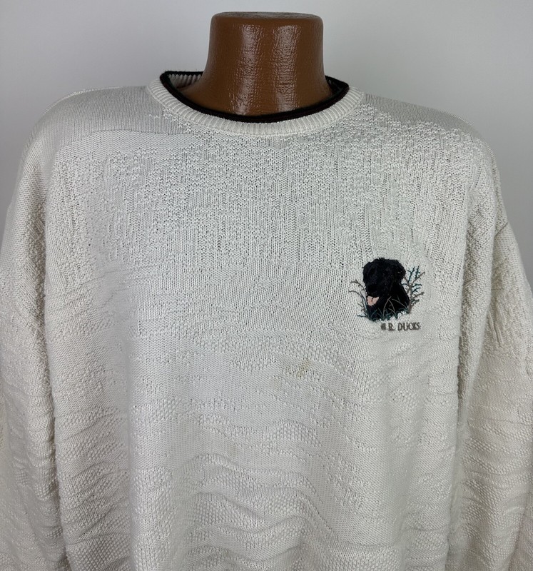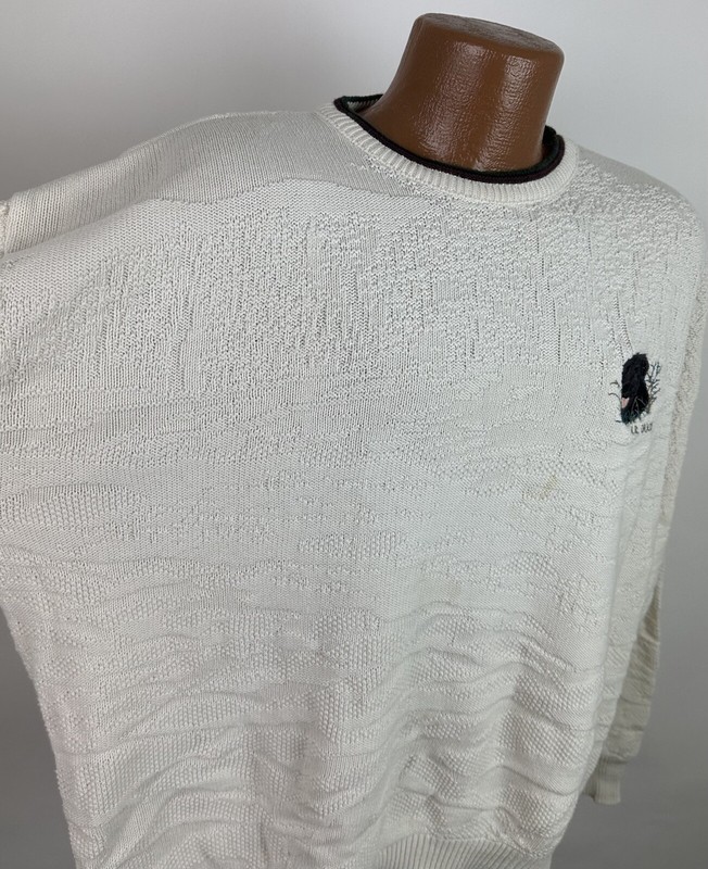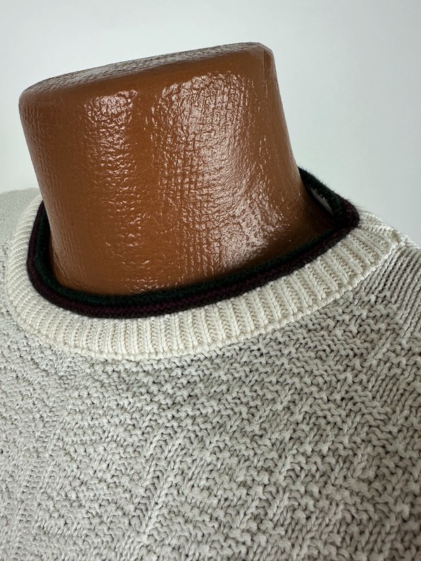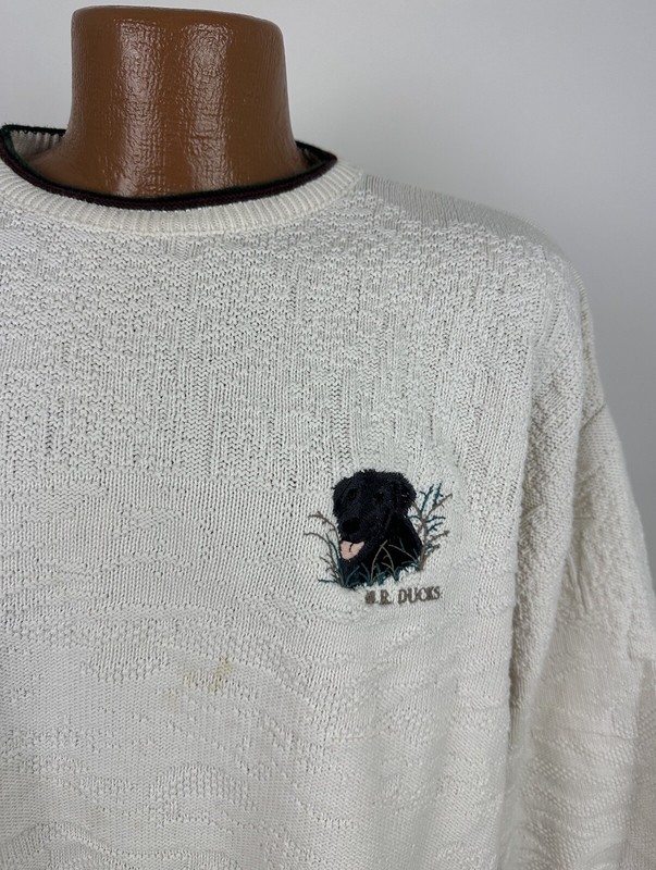 CONDITION: AS IS - stains at front chest, bottom hem and back sleeve hem - Item was washed but stains did not come out. Overall moderate general wear, fading, light pilling / fuzziness to knit. See pics for details. See measurements to ensure a proper fit.