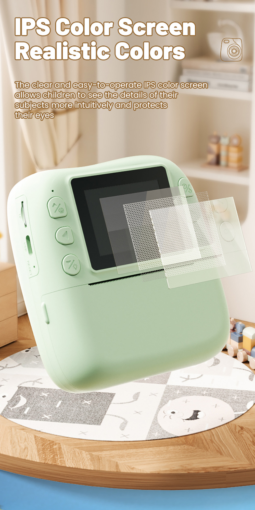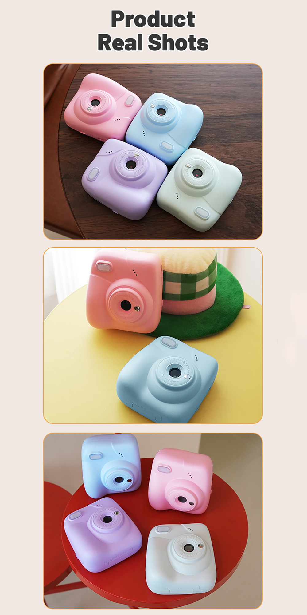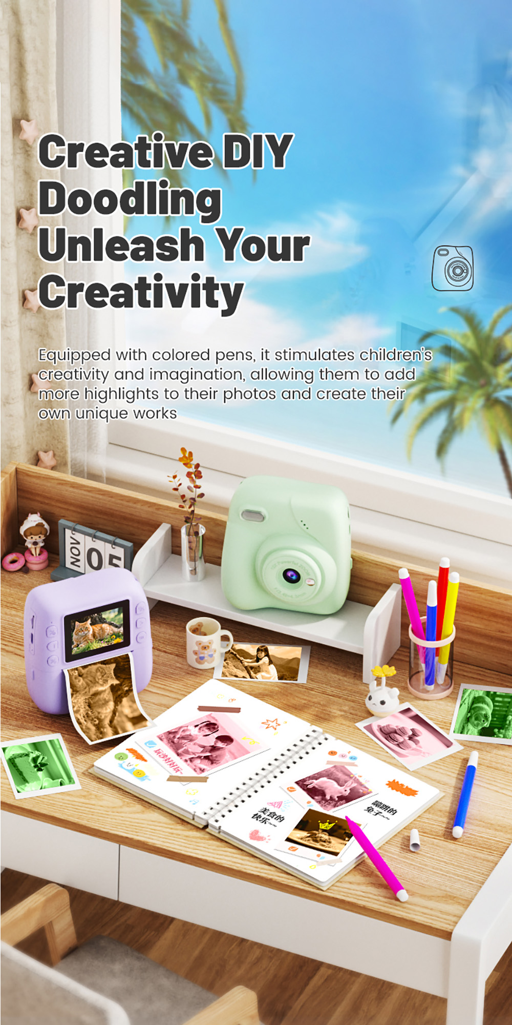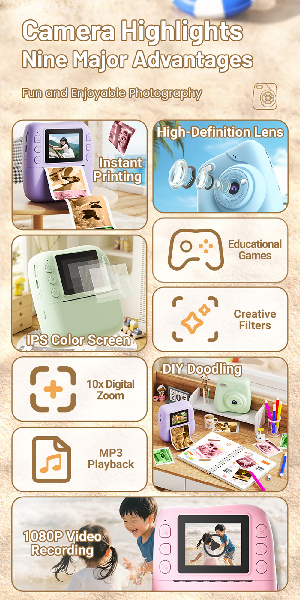 Features: 1. Instant Printing: 10X digital zoom High-Definition Lens,Fun and Enjoyable Photography. 2. 2.0in IPS: The clear and easy-to-operate lPS color screenallows children to see the details of their subjects more intuitively and protects their eyes. 3. 1080P Video: Easily record hioh definition, vivid VLoc shorts withclear and smooth playback. 4. Equipped with colored pens: it stimulates childreniscreativity and imagination, allowing them to addmore highlights to their photos. 5. Stickers and Filter: A wariety of cute stickers and filter elements can befreely combined, unleashing children's imagination. 6. MP3 Player: It's a Camera and Also an MP3 Player,With good sound quality, it's a portable music player. 7. 4 Games: Let children unknowingly receive intellectualexercise through entertainment. 8. LED Flash: Great Photos Evenin Low Light. 9. Multi-Languages: English, Traditional Chinese, Simplified Chinese, Japanese, French, German, Korean, Italian, Portuguese, Russian, Spanish, Arabic