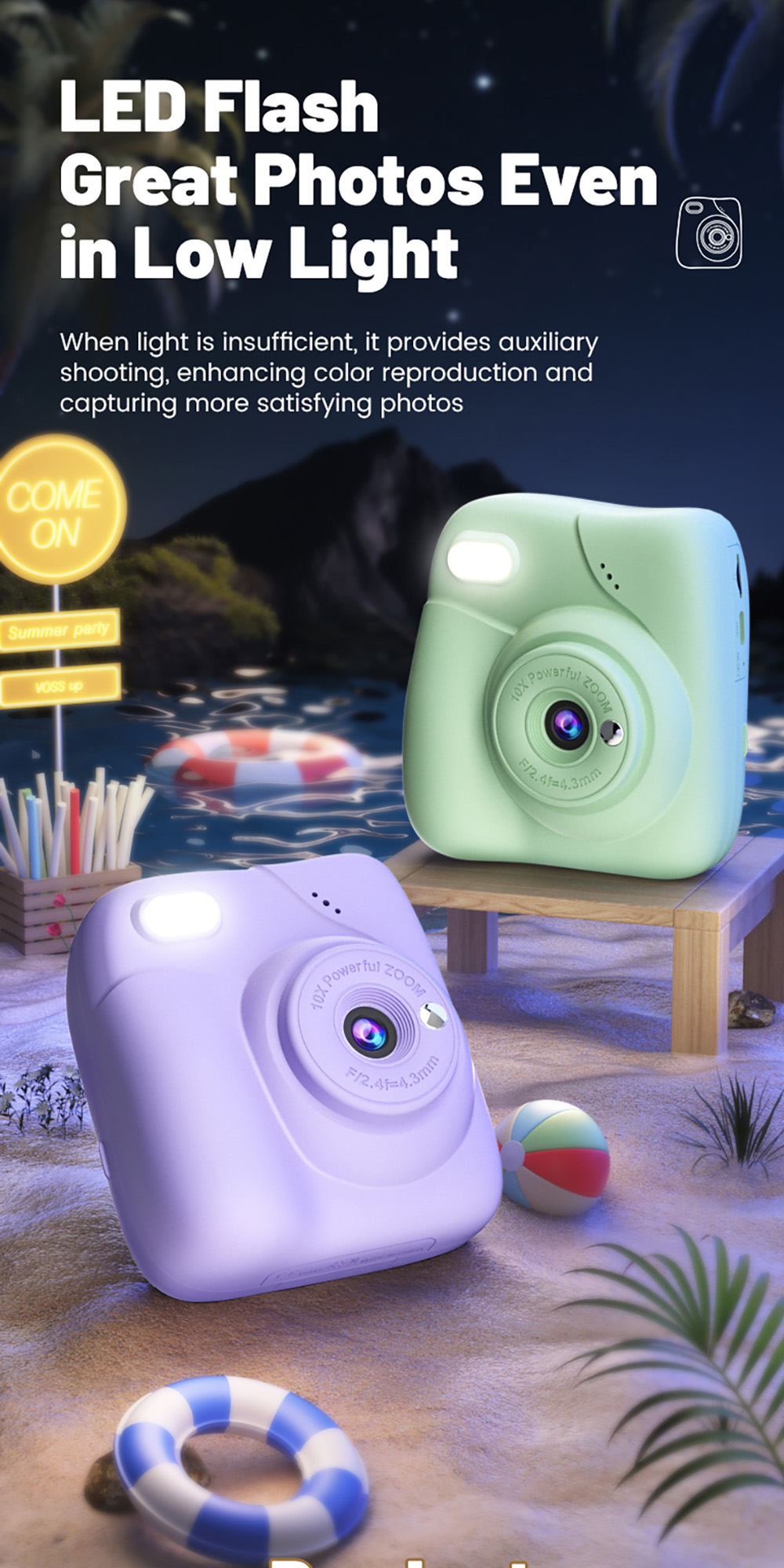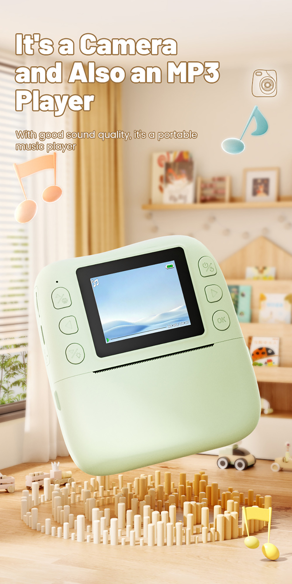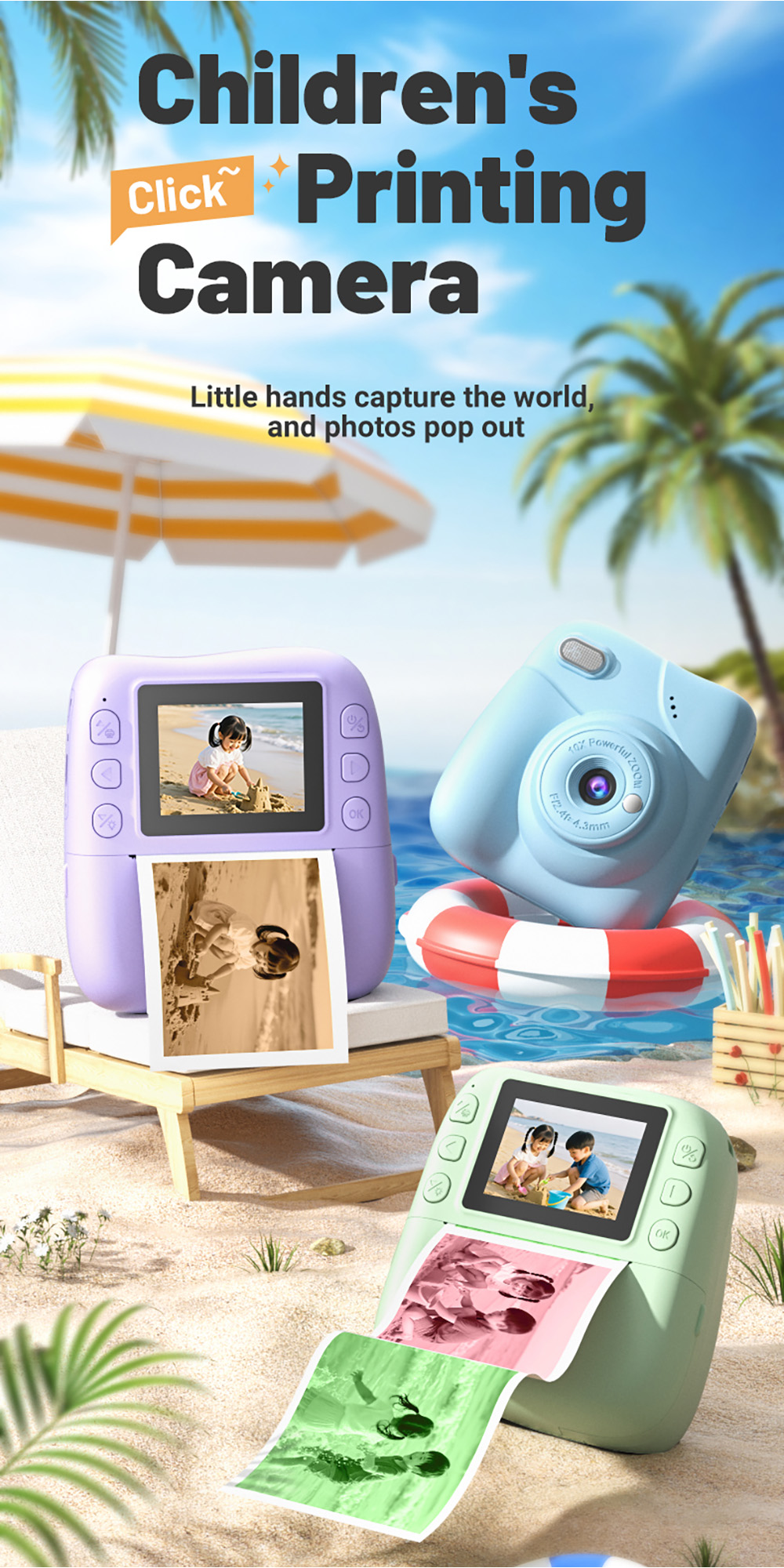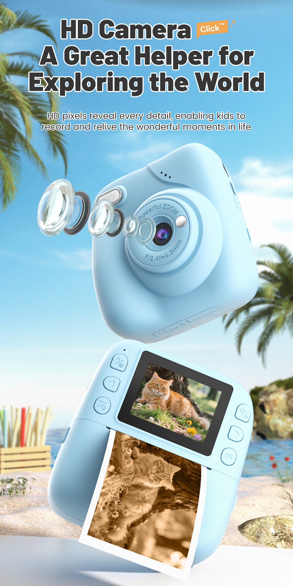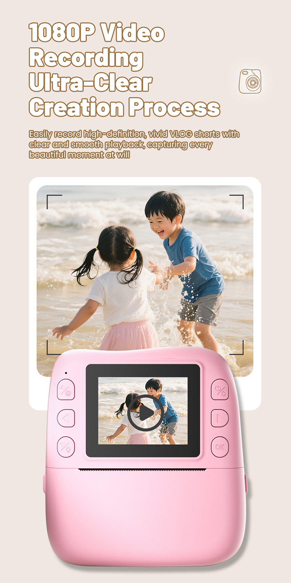 Features: 1. Instant Printing: 10X digital zoom High-Definition Lens,Fun and Enjoyable Photography. 2. 2.0in IPS: The clear and easy-to-operate lPS color screenallows children to see the details of their subjects more intuitively and protects their eyes. 3. 1080P Video: Easily record hioh definition, vivid VLoc shorts withclear and smooth playback. 4. Equipped with colored pens: it stimulates childreniscreativity and imagination, allowing them to addmore highlights to their photos. 5. Stickers and Filter: A wariety of cute stickers and filter elements can befreely combined, unleashing children's imagination. 6. MP3 Player: It's a Camera and Also an MP3 Player,With good sound quality, it's a portable music player. 7. 4 Games: Let children unknowingly receive intellectualexercise through entertainment. 8. LED Flash: Great Photos Evenin Low Light. 9. Multi-Languages: English, Traditional Chinese, Simplified Chinese, Japanese, French, German, Korean, Italian, Portuguese, Russian, Spanish, Arabic