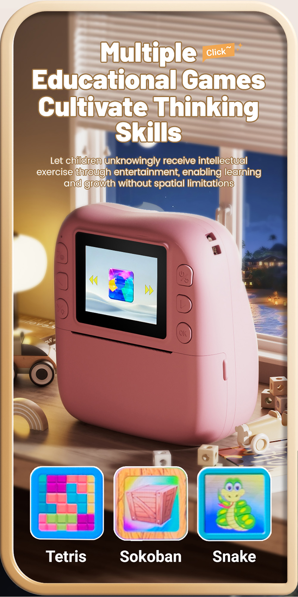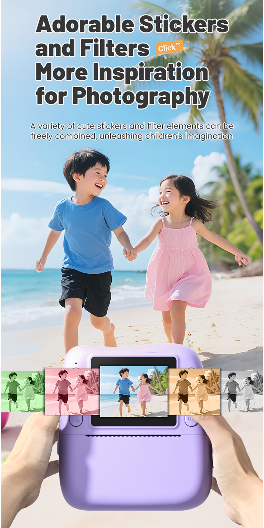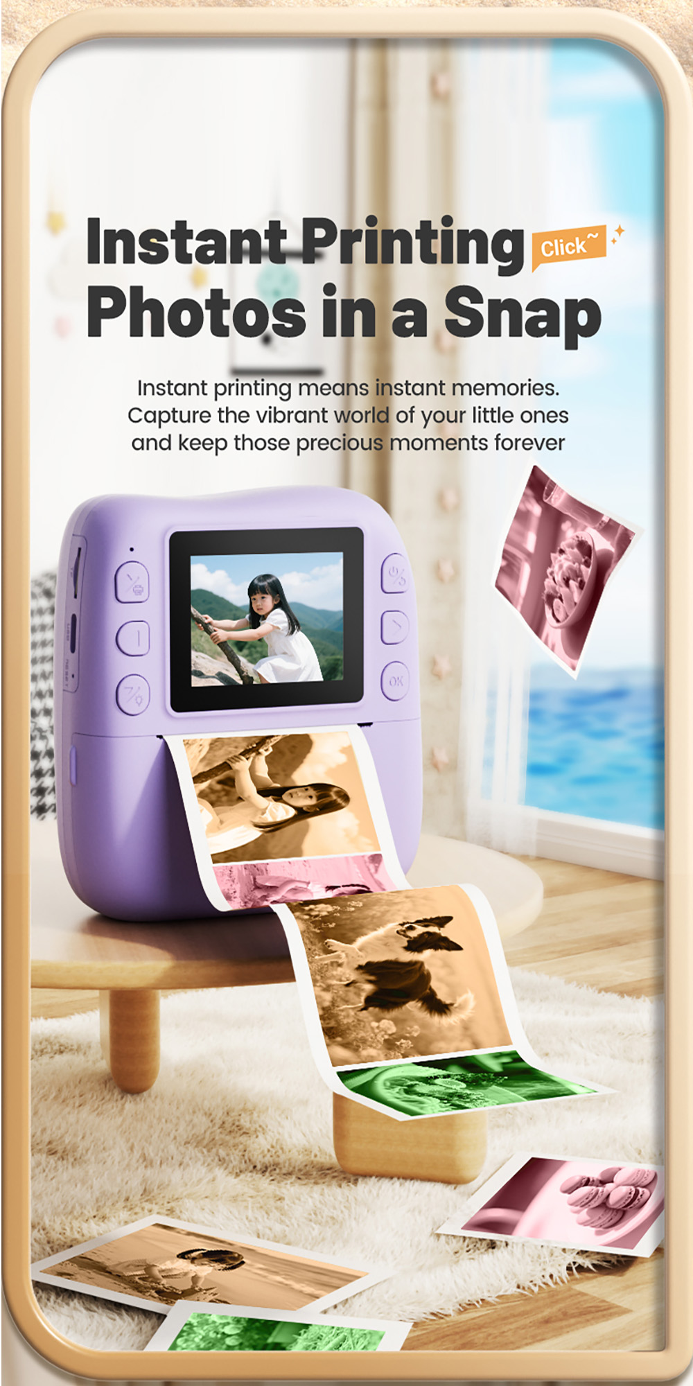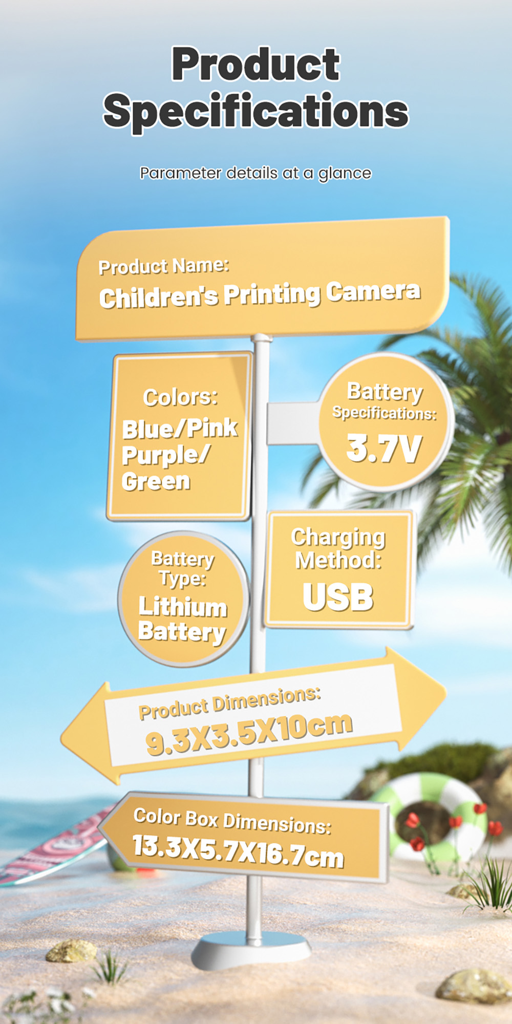 Features: 1. Instant Printing: 10X digital zoom High-Definition Lens,Fun and Enjoyable Photography. 2. 2.0in IPS: The clear and easy-to-operate lPS color screenallows children to see the details of their subjects more intuitively and protects their eyes. 3. 1080P Video: Easily record hioh definition, vivid VLoc shorts withclear and smooth playback. 4. Equipped with colored pens: it stimulates childreniscreativity and imagination, allowing them to addmore highlights to their photos. 5. Stickers and Filter: A wariety of cute stickers and filter elements can befreely combined, unleashing children's imagination. 6. MP3 Player: It's a Camera and Also an MP3 Player,With good sound quality, it's a portable music player. 7. 4 Games: Let children unknowingly receive intellectualexercise through entertainment. 8. LED Flash: Great Photos Evenin Low Light. 9. Multi-Languages: English, Traditional Chinese, Simplified Chinese, Japanese, French, German, Korean, Italian, Portuguese, Russian, Spanish, Arabic