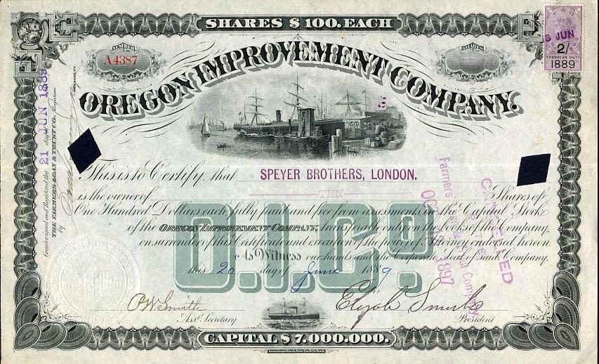 1889 Oregon Improvement Co Stock Certificate signed Elijah Smith. Attractive western railroad coal and steamship transportation scripophily certificate with vignette of ships moored at wharf. The Oregon Improvement Company owned and operated coal mines, railroads, and steamship companies in Washington and Oregon. Launched by financier Henry Villard, the Oregon Improvement Company in 1880 wanted to link rail, river, and ocean transport, and he was interested in developing coal both as fuel and as payload. The company had financial problems from the beginning, and failed in 1884. Elijah Smith replaced Villard in 1884, but financial troubles persisted. The Pacific Coast Company purchased and absorbed the Oregon Improvement Company in 1896.
