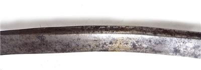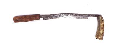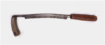 A Cooper's draw shave, 17 3/8" long, with a 8 1/2" wide blade, and hafts perpendicular to each other, from a partial set of cooper's tools of Mid-Atlantic States origin that we are listing. The haft, in the same plane as the blade, is softwood. The other haft, at 90°, is cow horn. It is in very good condition, with an old, long un-touched surface, with short checks in the hafts, and no other condition issues. The blade is not nicked, and should take a very sharp edge.