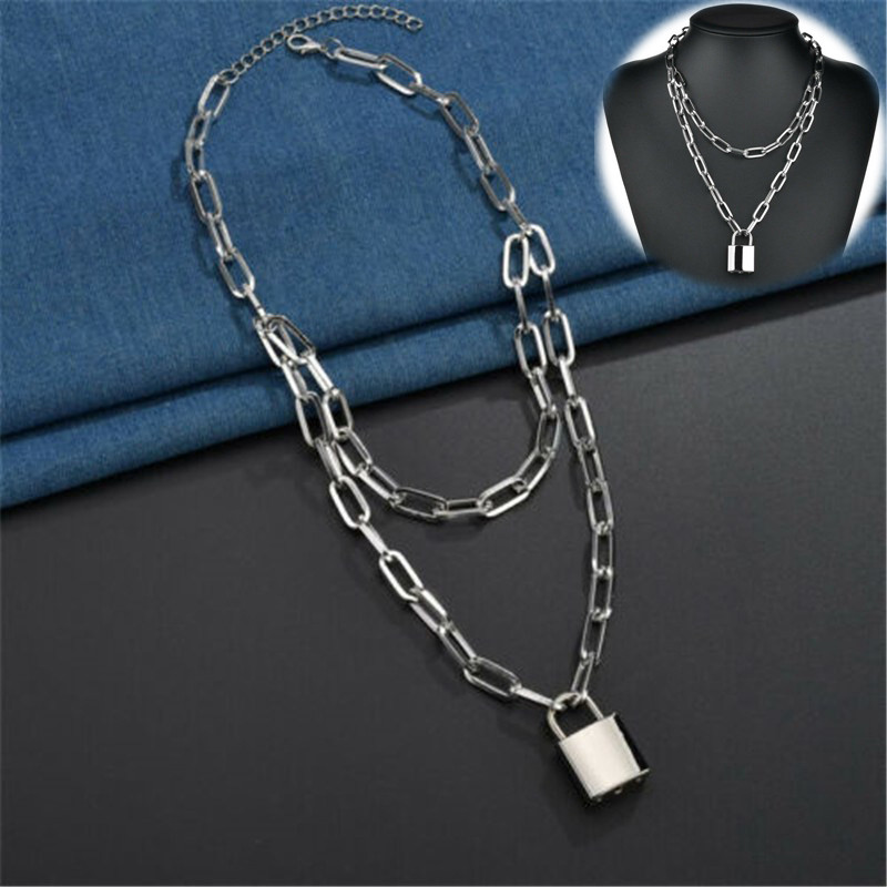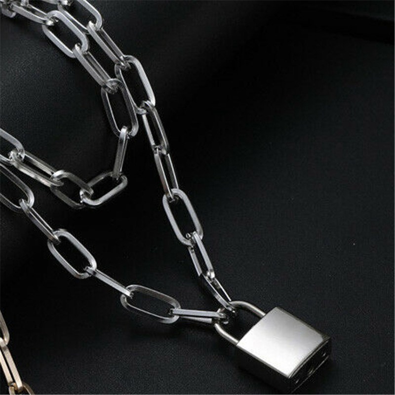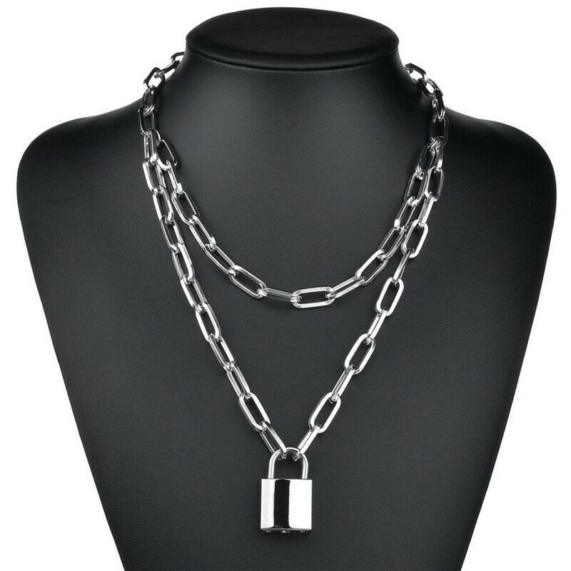 Necklace Padlock Punk Chunky Chain Layered Lock Women silver Key Pendant