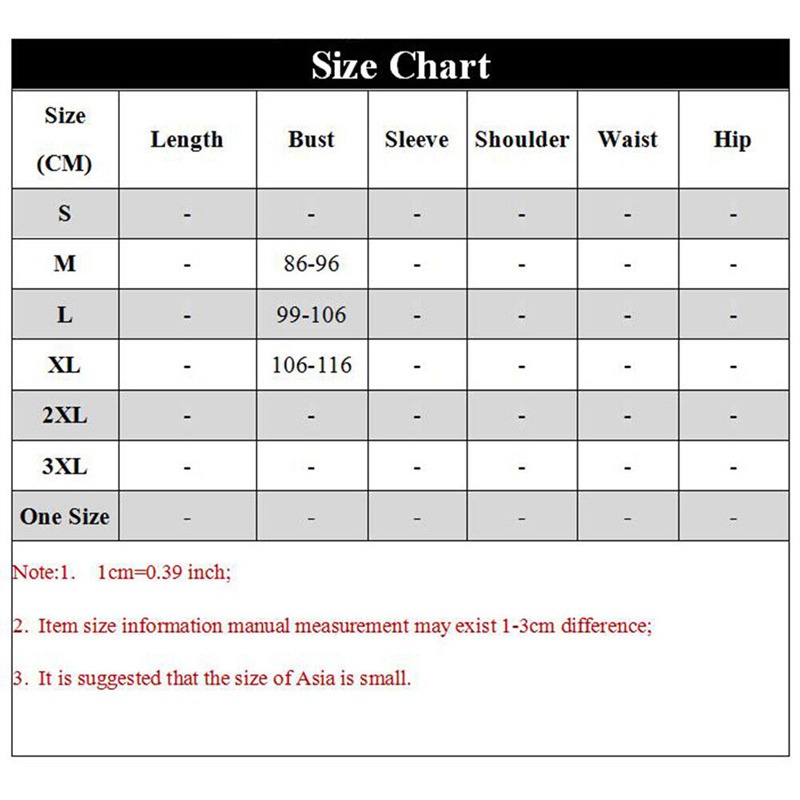 SIZE:Bust:M:86-96cm  L:99-106cm XL:106-116cmNote:1. 1cm=0.39 inch;2.Item size information manual measurement may exist 1-3cm difference;3.It is suggested that the size of Asia is small.