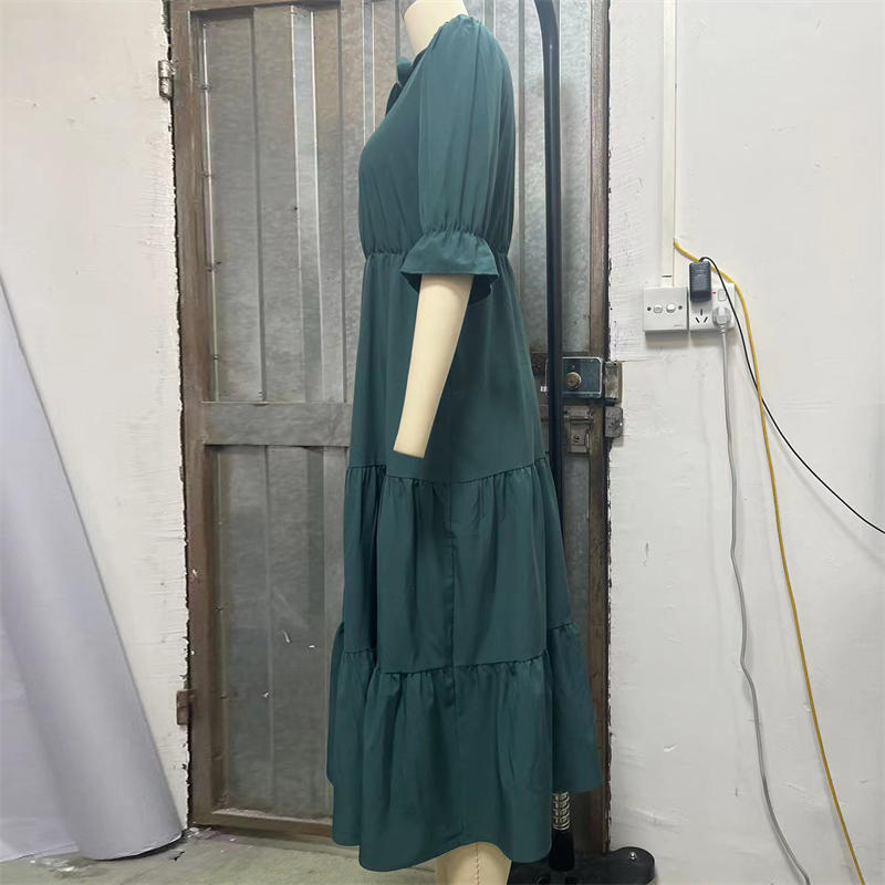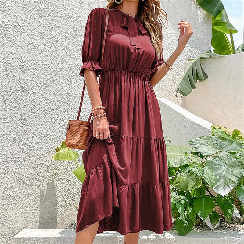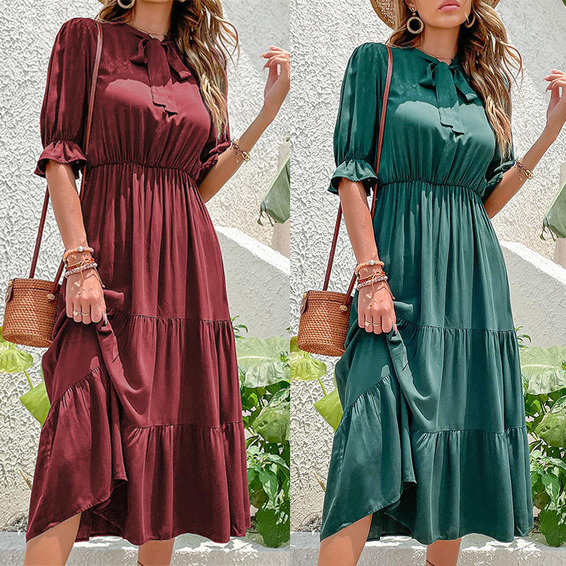 Women's Clothing Fashion Ribbon Long Skirt Wrinkle Bow Solid Color Dress