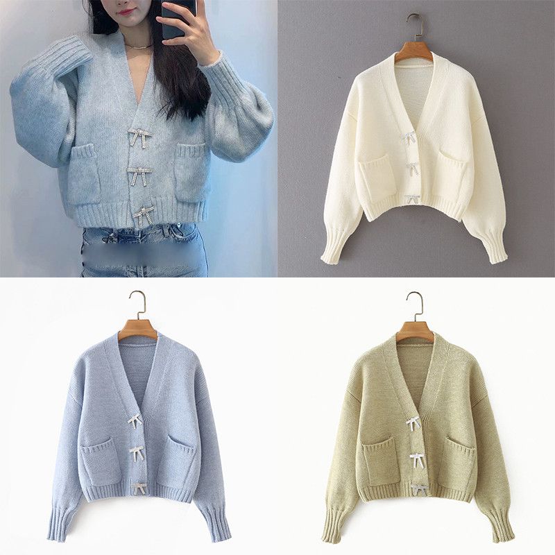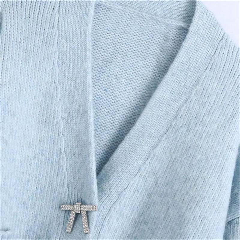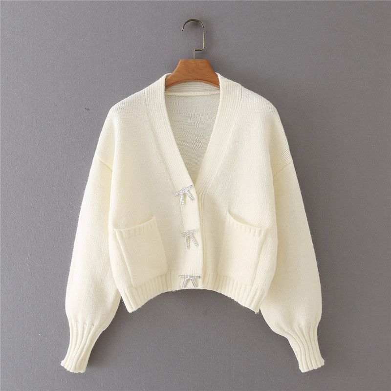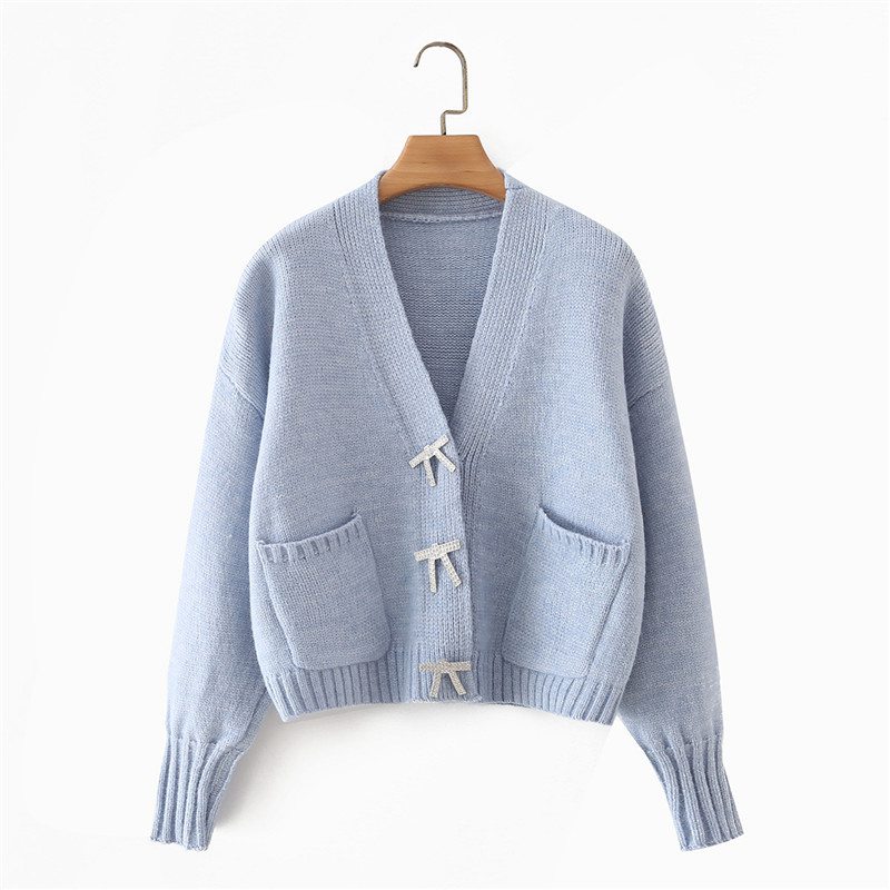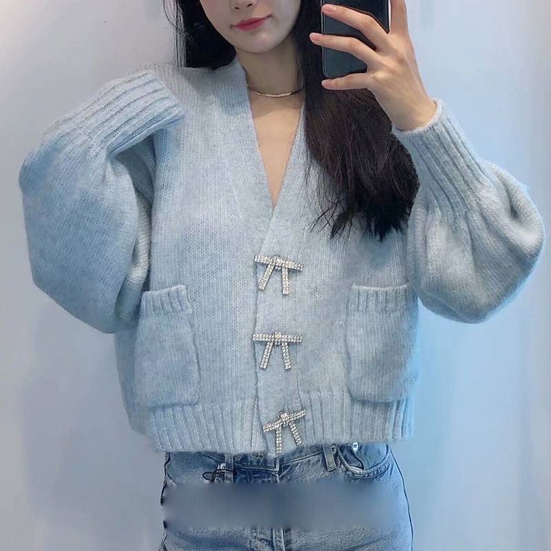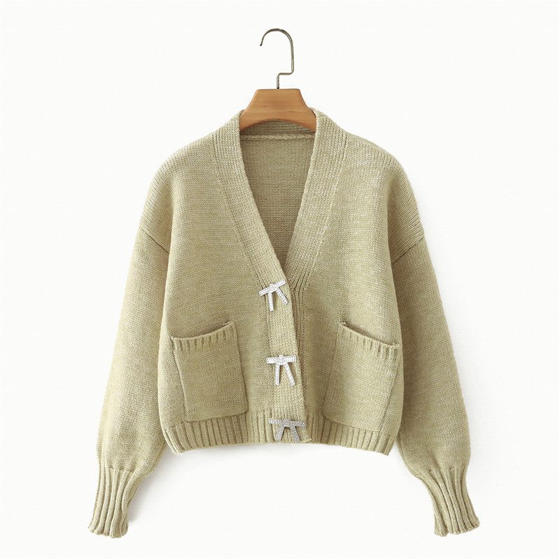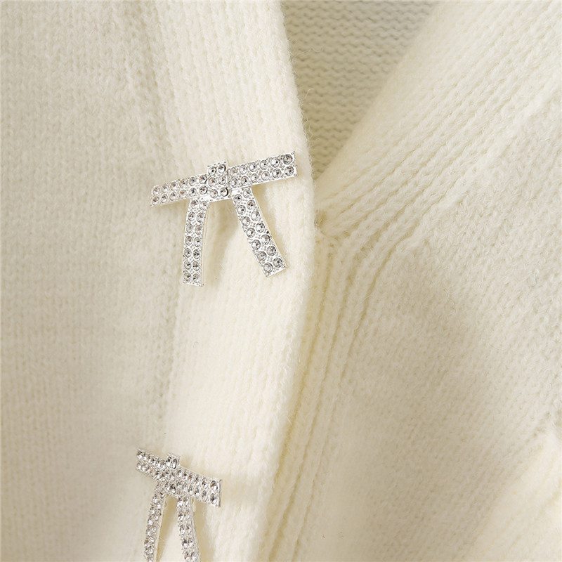 Fashion Chic Knitted Cardigan Sweater Women Long Sleeve Rhinestone Buttons Loose