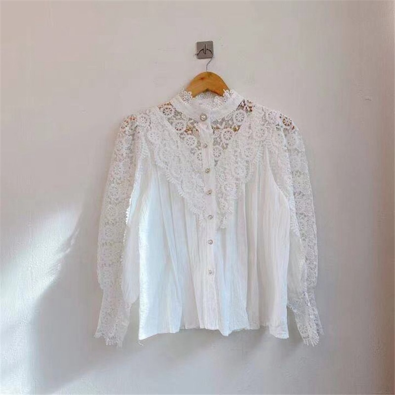 Loose Shirt Button Vintage Lace Shirts Stand-Up Collar Shirt Solid White Women