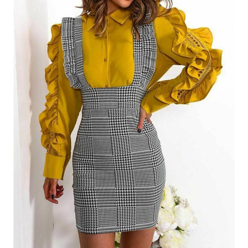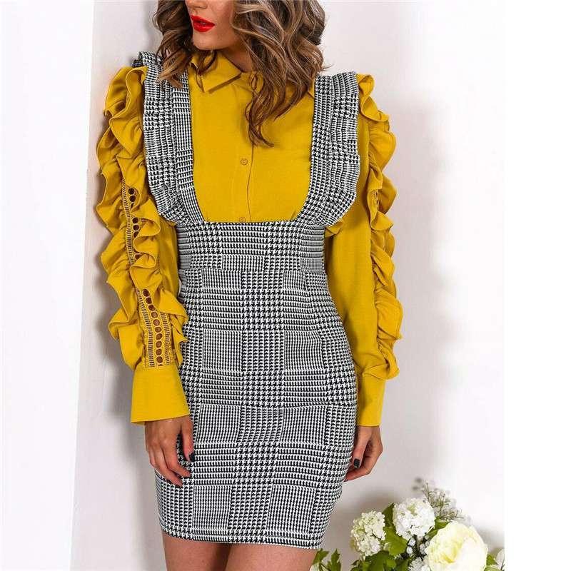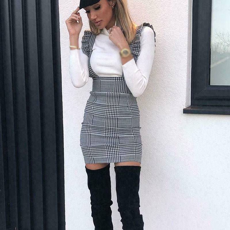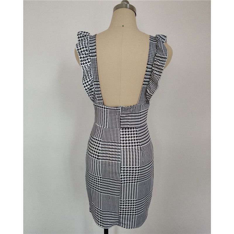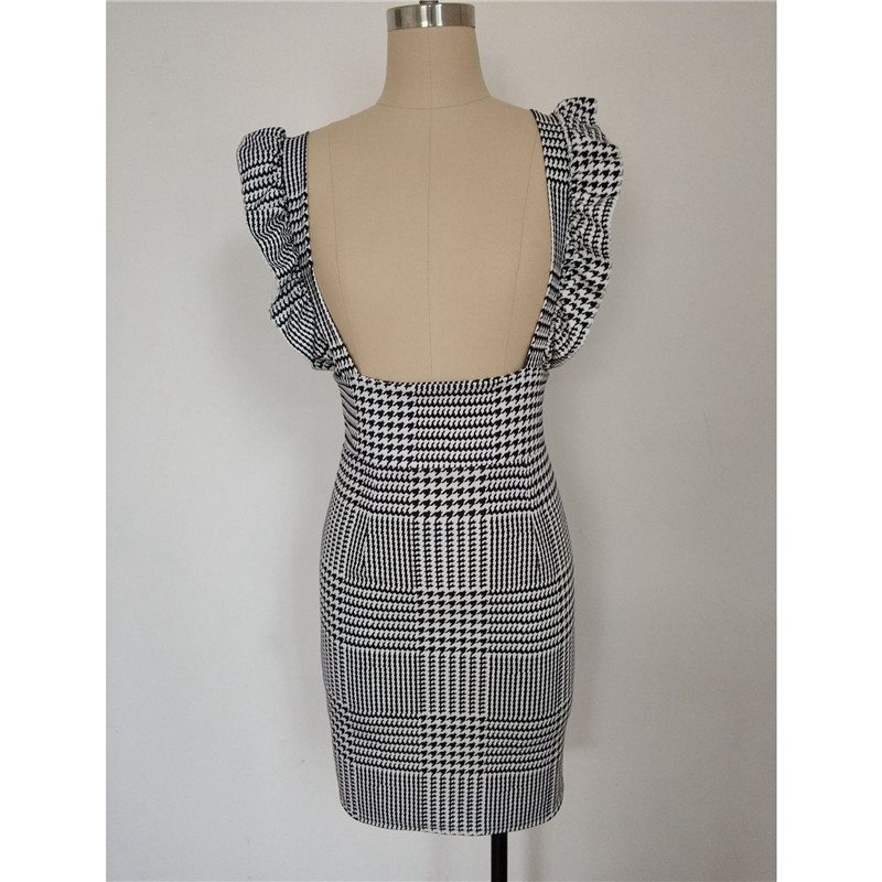Ladies Womens Bodycon New Mini Dress Frill Pinafore Hound Dog Tooth Check Ruffle