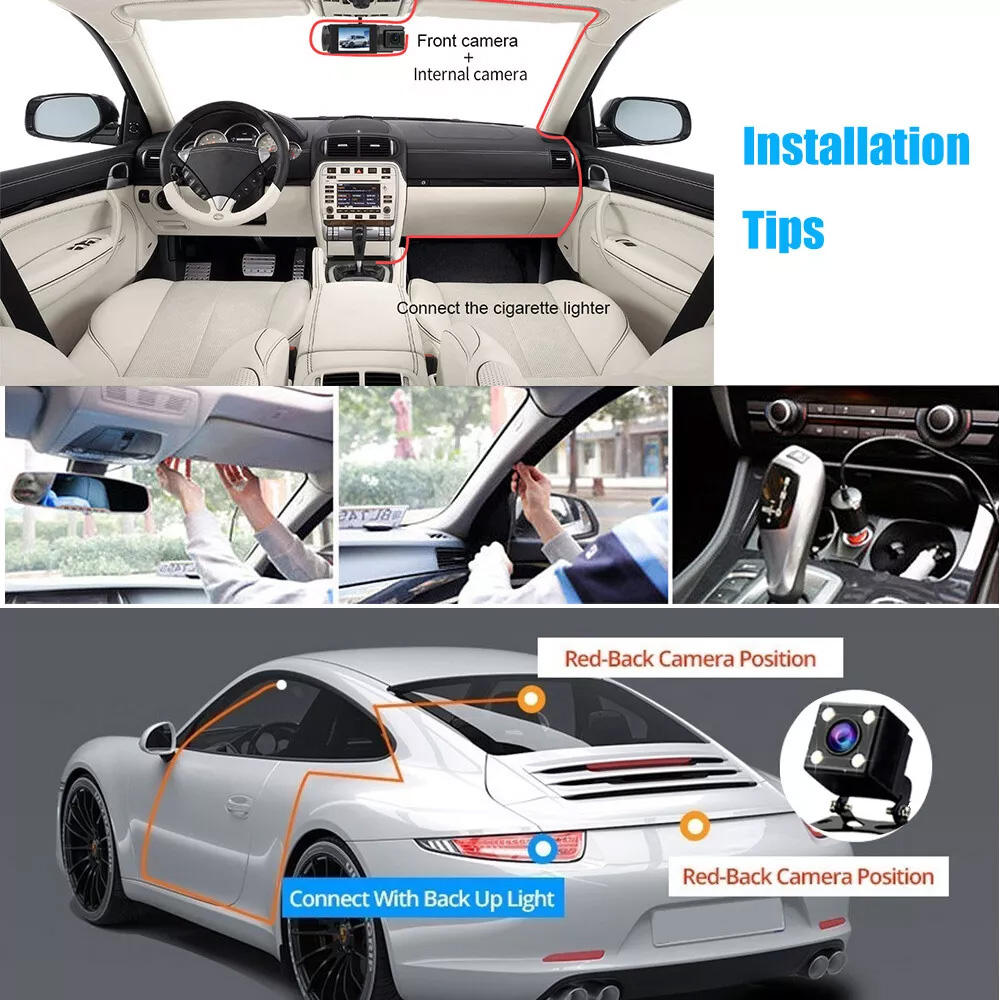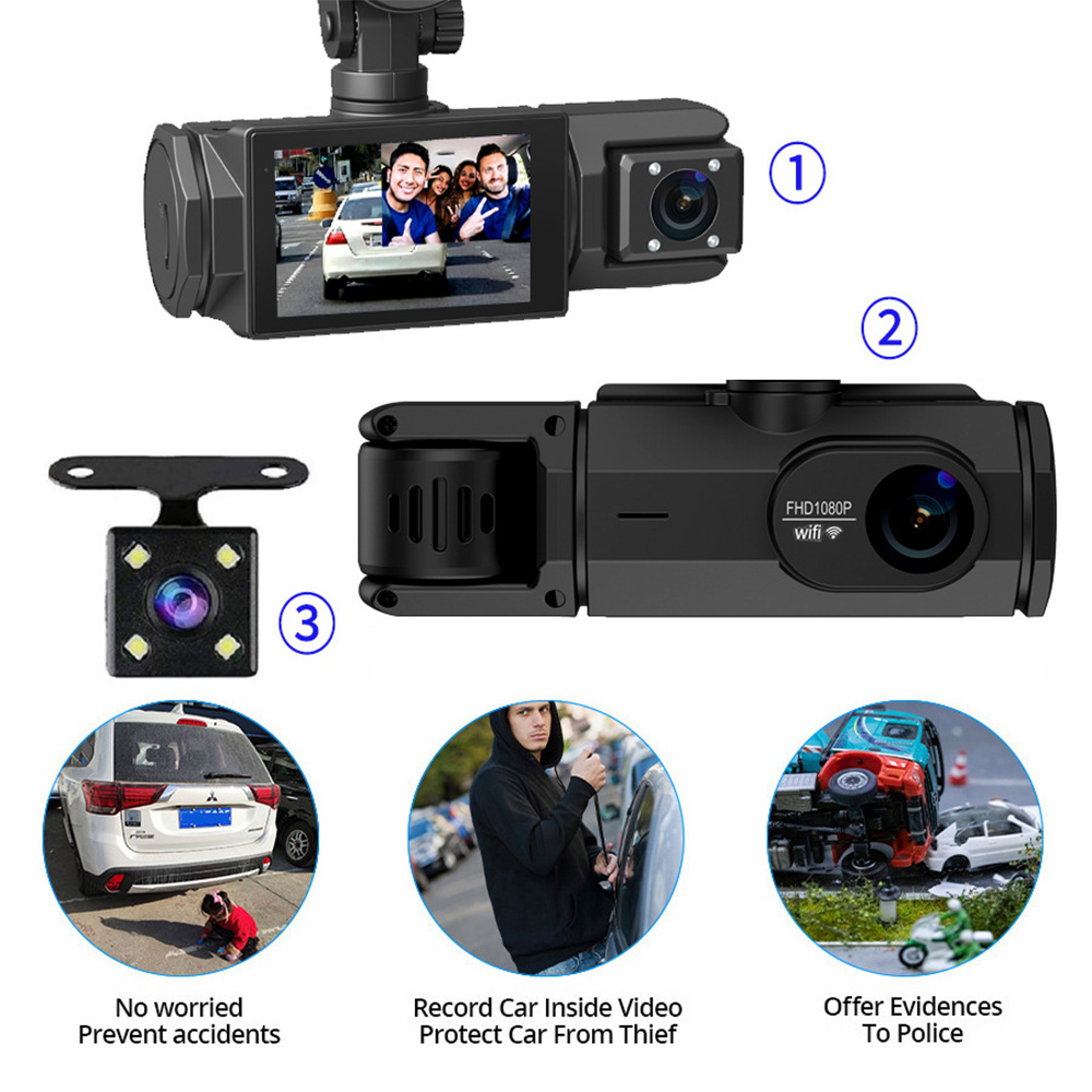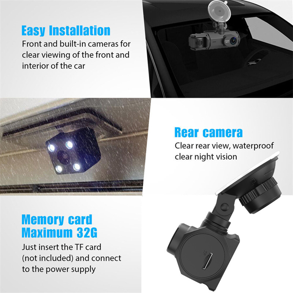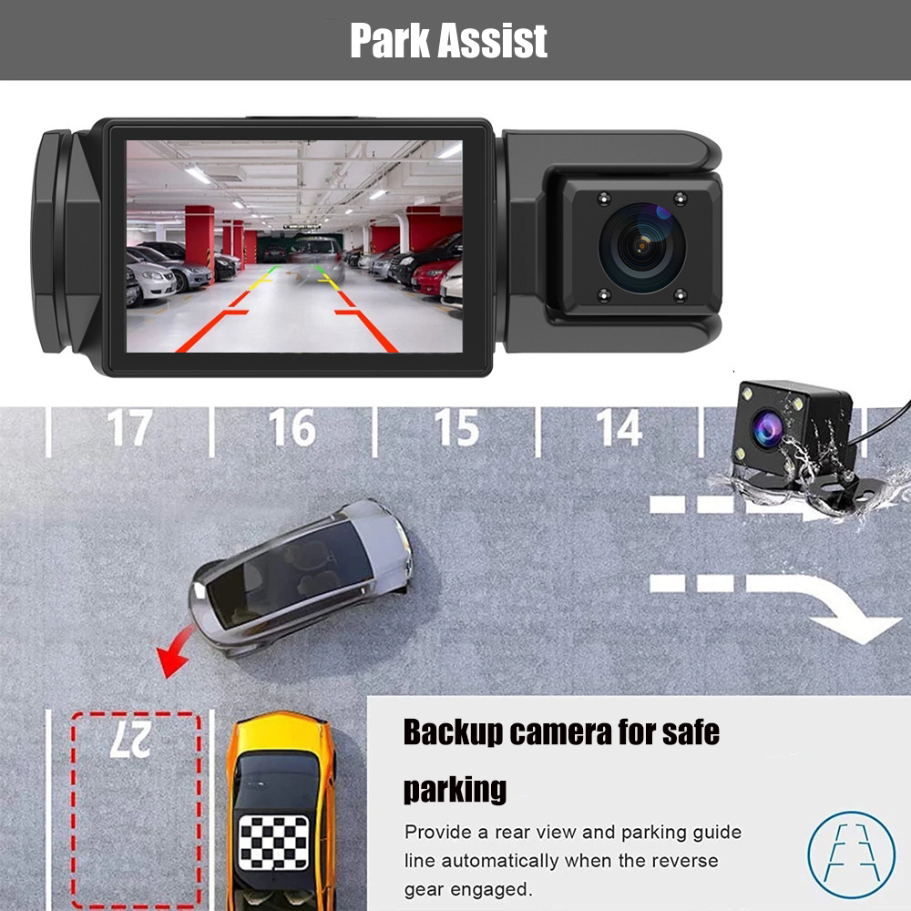 3-Kanal-CAM vorne, hinten und innen: Dieses Dashcam-System umfasst eine 1080P-Frontkamera, eine 720P-Rückkamera und eine 480P-Innenkamera, die eine umfassende Überwachung Ihres Fahrzeugs bietet und gleichzeitig visuelle tote Bereiche reduziert. Der mit dem IPS-Panel hergestellte Bildschirm ermöglicht es Ihnen, in jedem Winkel ein klares Bild zu sehen, ohne dass es zu Unschärfen kommt. Helfen Sie dabei, Beweise zu behalten und bereitzustellen, wenn ein Unfall auftritt