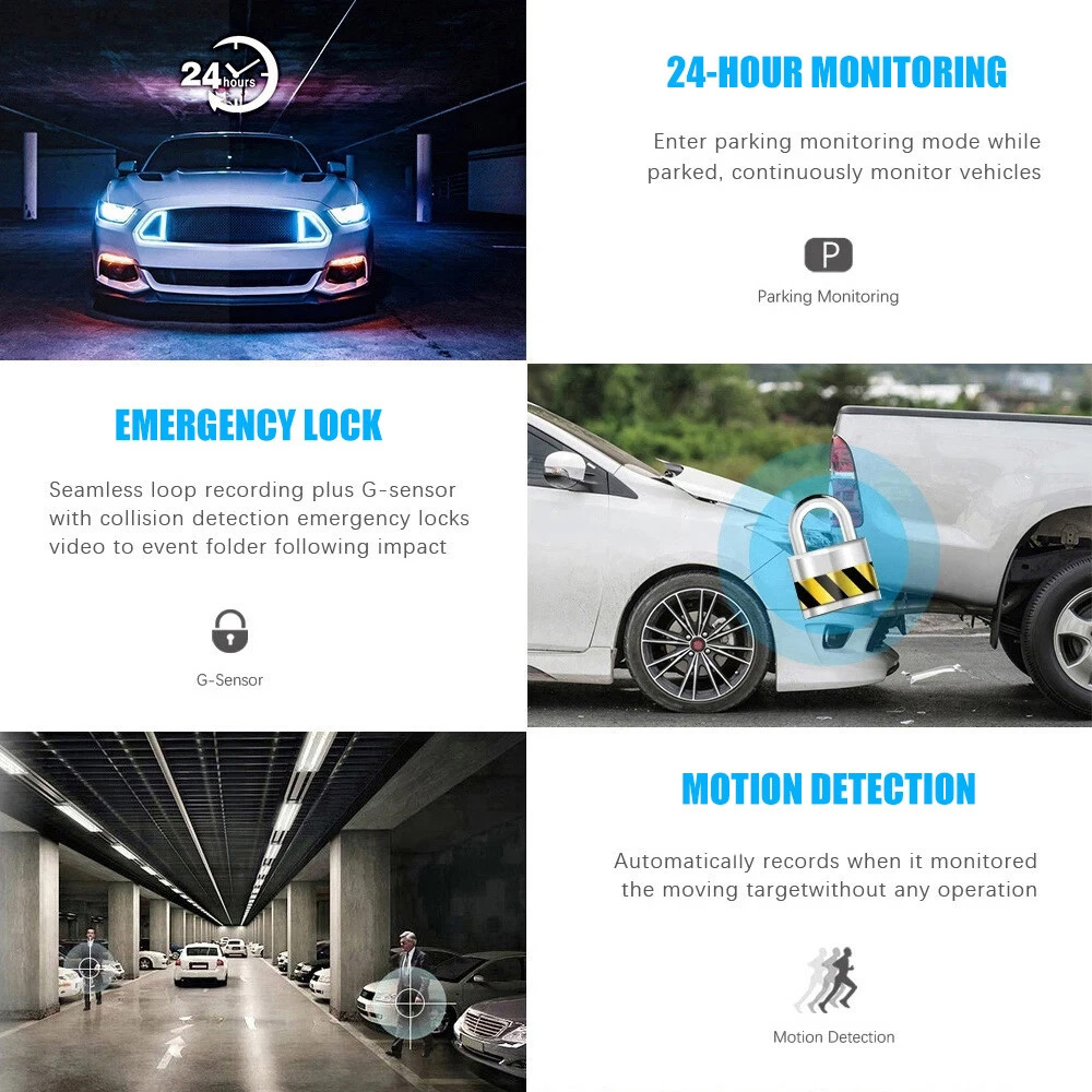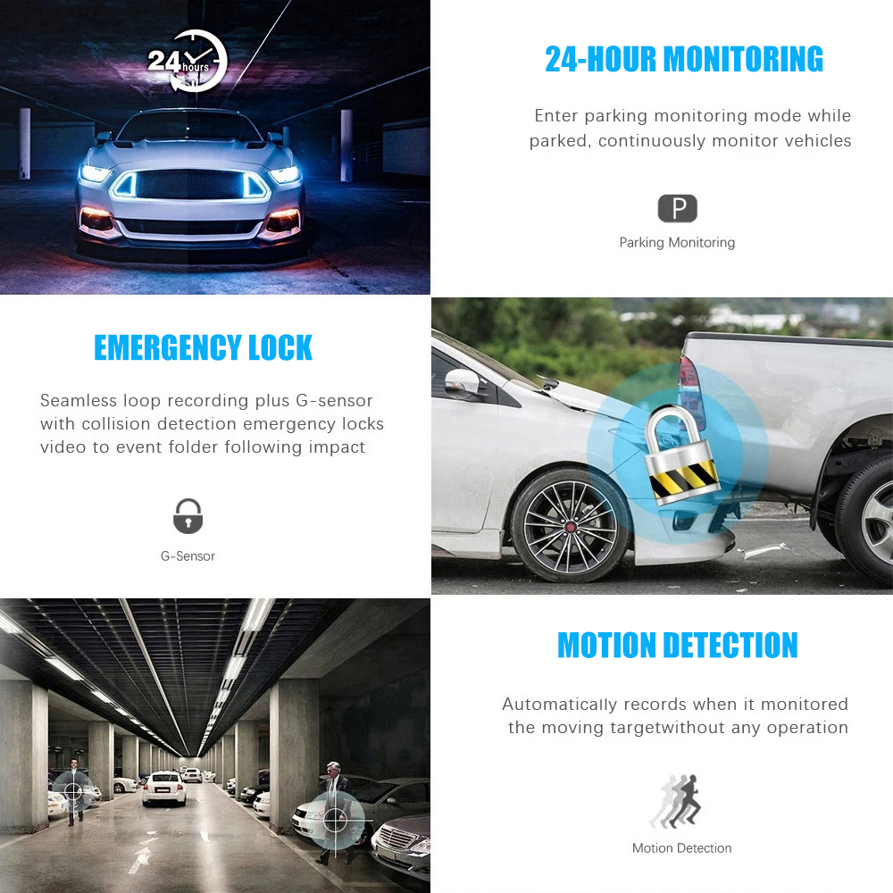 G-SENSOR & 24H PARKING MONITOR: Der eingebaute G-Sensor aktiviert die Notaufnahme und sperrt aufgezeichnete Videos, wenn plötzliche Erschütterungen oder Kollisionen erkannt werden. Die 24-Stunden-Parkmonitorfunktion beginnt automatisch mit der Aufnahme, wenn Vibrationen im Parkmodus erkannt werden, und bietet Ihrem Fahrzeug rund um die Uhr Schutz, selbst wenn Sie und # 39;erne entfernt.