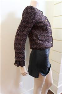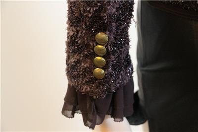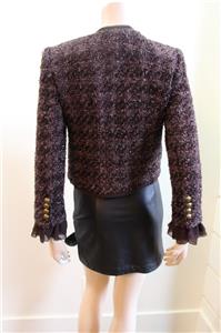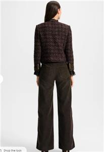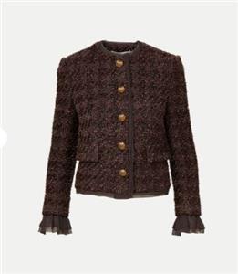 The classic lady jacket—with a high-shine twist. Crafted from maroon tweed with a metallic houndstooth pattern, the Audrina features a fitted, cropped silhouette and collarless neckline. A sheer trim and removable peekaboo ruffled cuffs add a touch of romance, while gold-ribbed buttons add a statement finish. Pair with corduroy jeans for everyday ease or a maxi skirt for a more polished look.