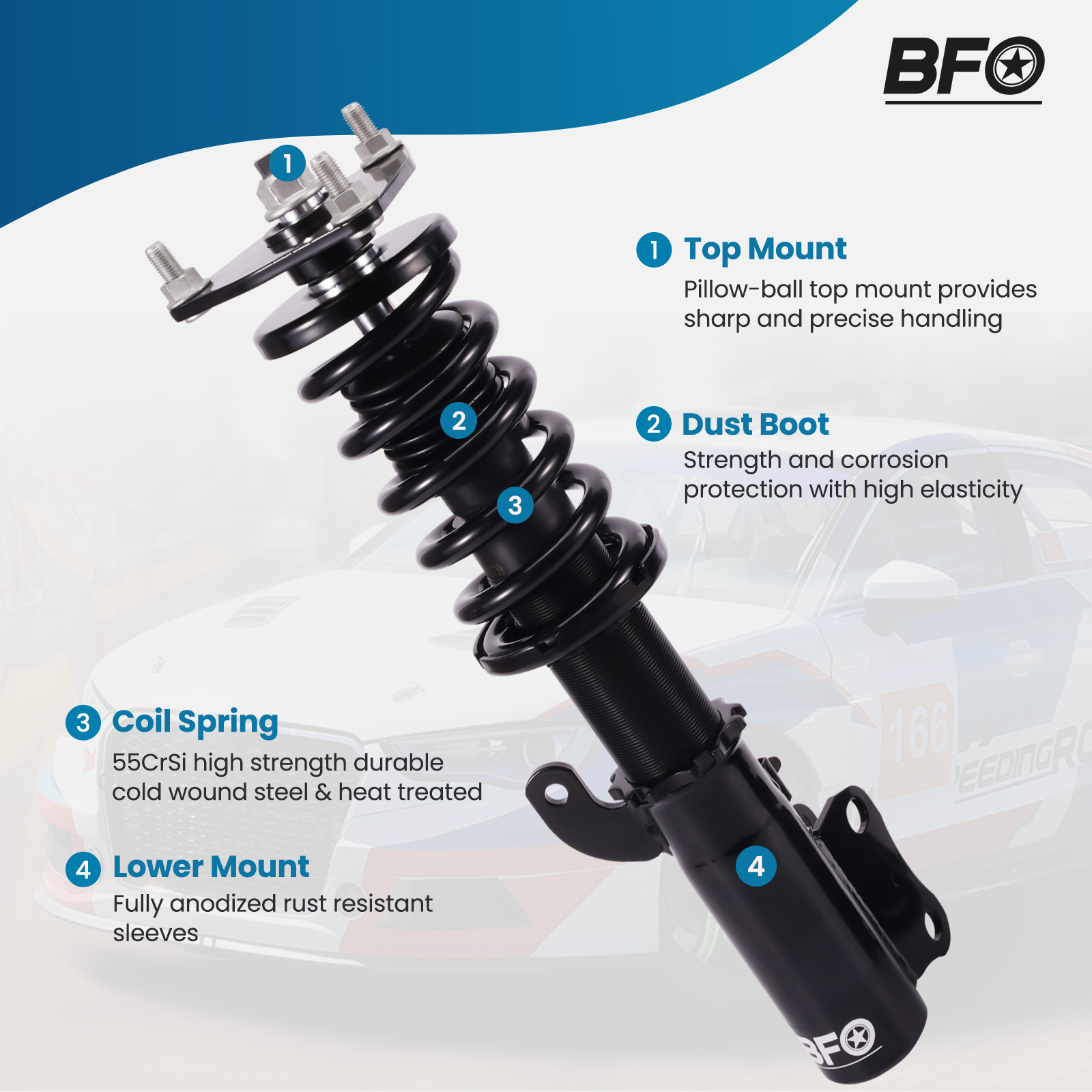 Aluminum Top Mounts with Pillow Ball provide bind free operation and precise feed-back to the driver