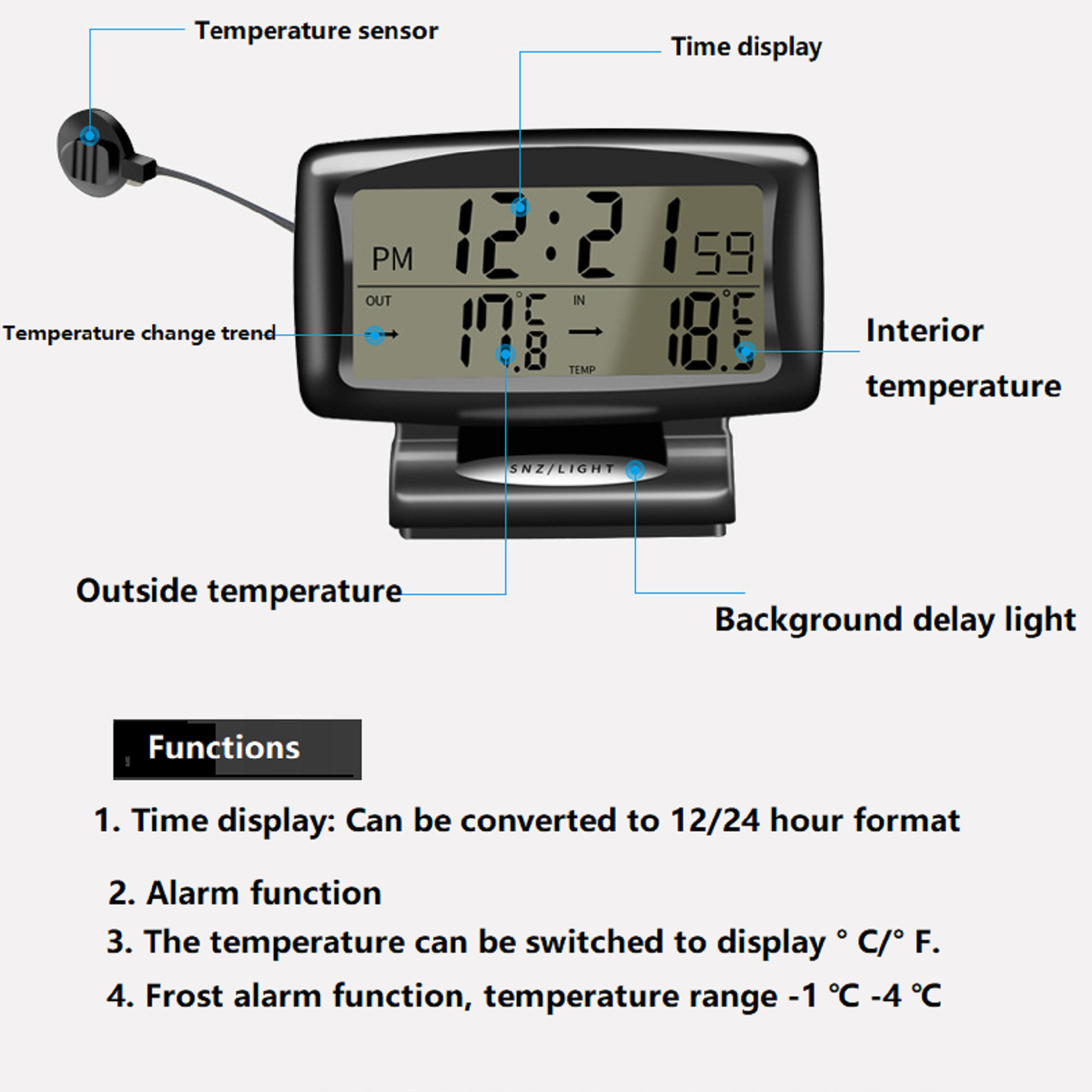 Car Thermometer LED Screen Time Clocks Multifunctional Temperature Electronic Digital Clock With Blacklight Function