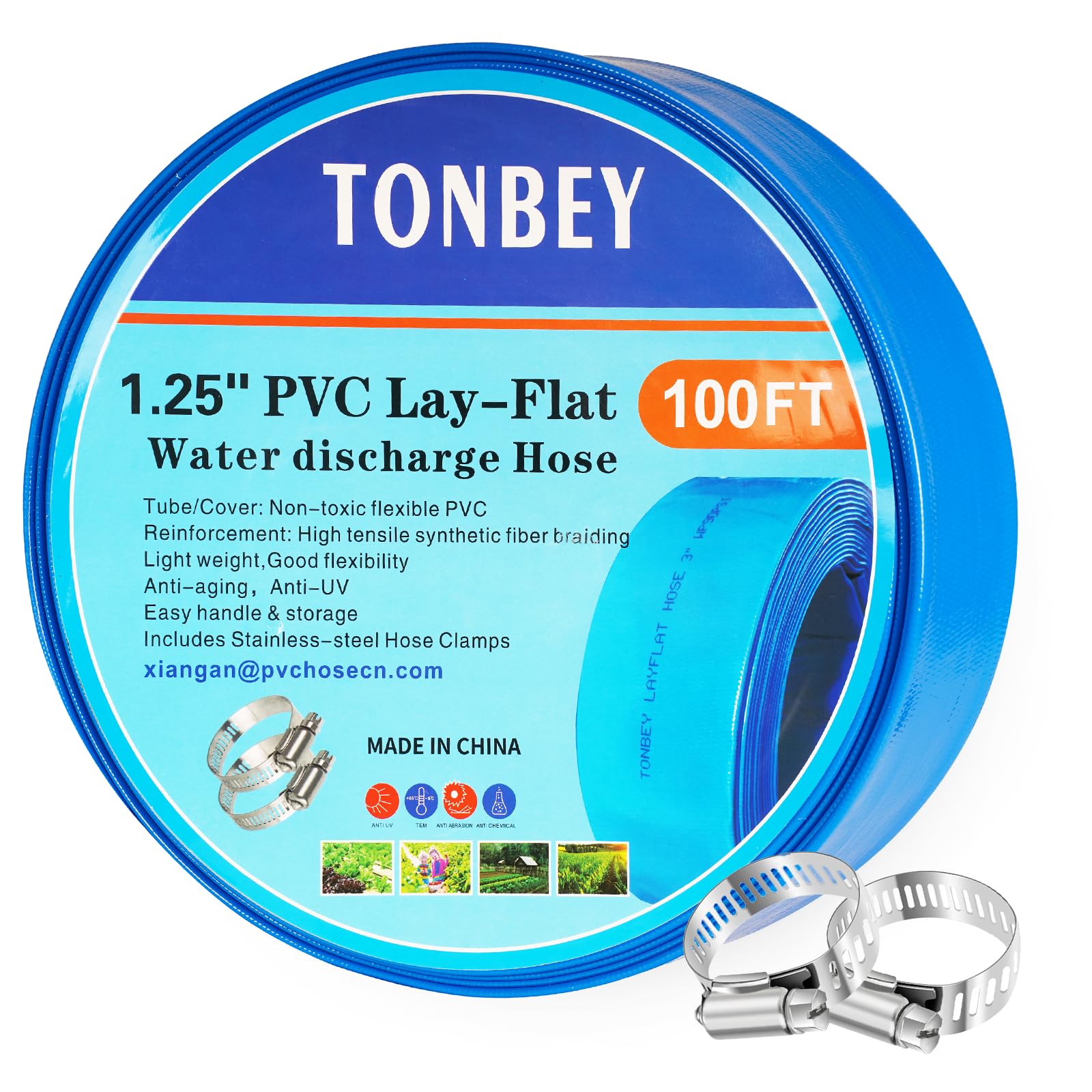 1.25 in x 100 FT Blue PVC Backwash Hose Product name : Pool Hose Product size:13.6 x 13.6 x 2.34 inch weight : 12.72 lb High-quality material: The product is made of high-quality PVC, which is known for its excellent durability, only against abrasion, but also against corrosion, especially suitable for outdoor swimming pool environments, to ensure long-term stable working performance and service life. Versatility: With a working pressure of 6 bar, the hose is suitable for a wide range of medium and high pressure drainage and backwashing requirements. It can be used in a wide range of temperatures, from cold -5°C to hot 65°C (i.e. 23°F to 149°F), and can be kept in good working condition in both winter and summer, meeting the requirements of different seasons and regions. Easy Installation and Maintenance: Each hose comes with a pair of stainless steel clamps designed to quickly secure the hose and ensure a tight seal at the connection, simplifying installation and enhancing system stability. No additional fittings are required and the system is ready to use. Innovative, space-saving design: The hose's unique design allows it to be easily folded flat, dramatically reducing the amount of space required for storage. This feature allows the hose to be efficiently stored when in use, which greatly improves storage efficiency and keeps the environment tidy and organized, whether it's in a home pool or a commercial setting.