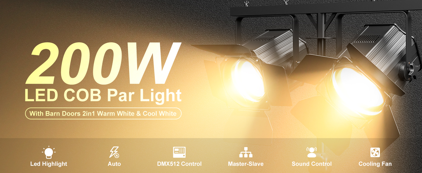Par Lights COB 200W Linear Spotlights with Barn Door Warm & Cold White Par Lights Stage Lights DMX512 Sound Activated DJ Lights for Stage, Party, Concert, Church, Wedding, Theater