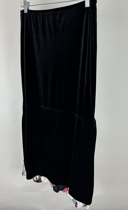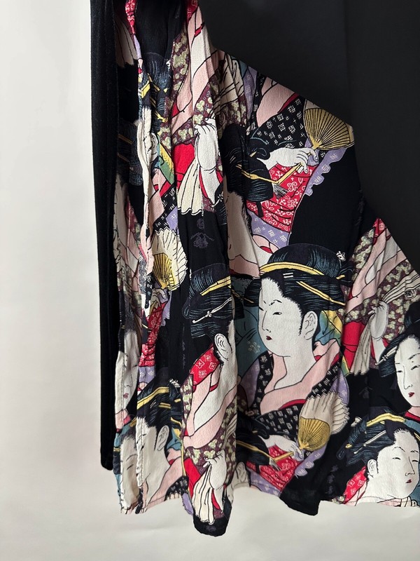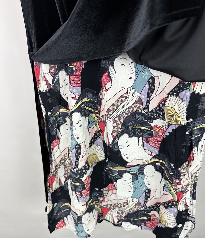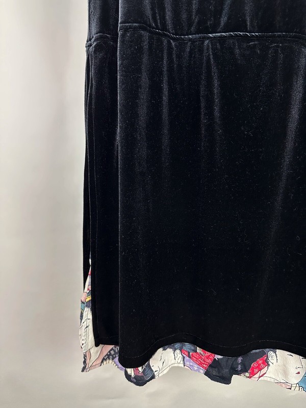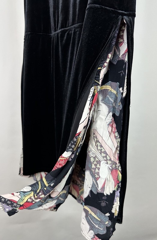 + Layered with novelty print fabric at bottom hem and slits at sides