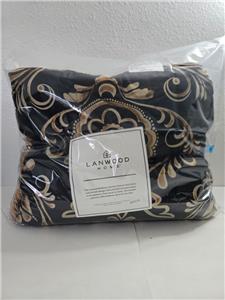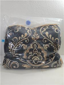 Add a touch of modern elegance to any bedroom's look with the bold damask-inspired prints and rich gold accents of this Sabrina bedding ensemble.