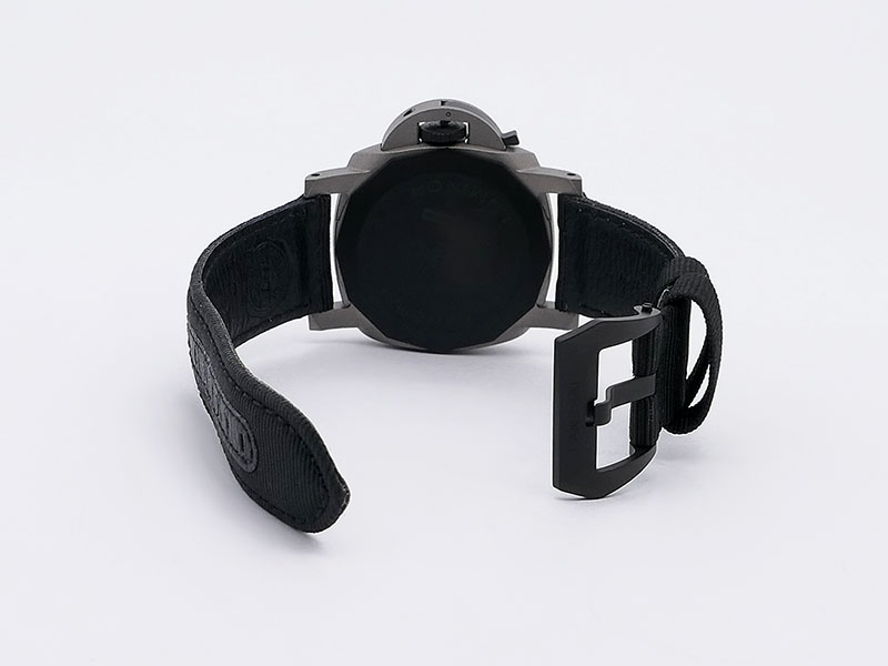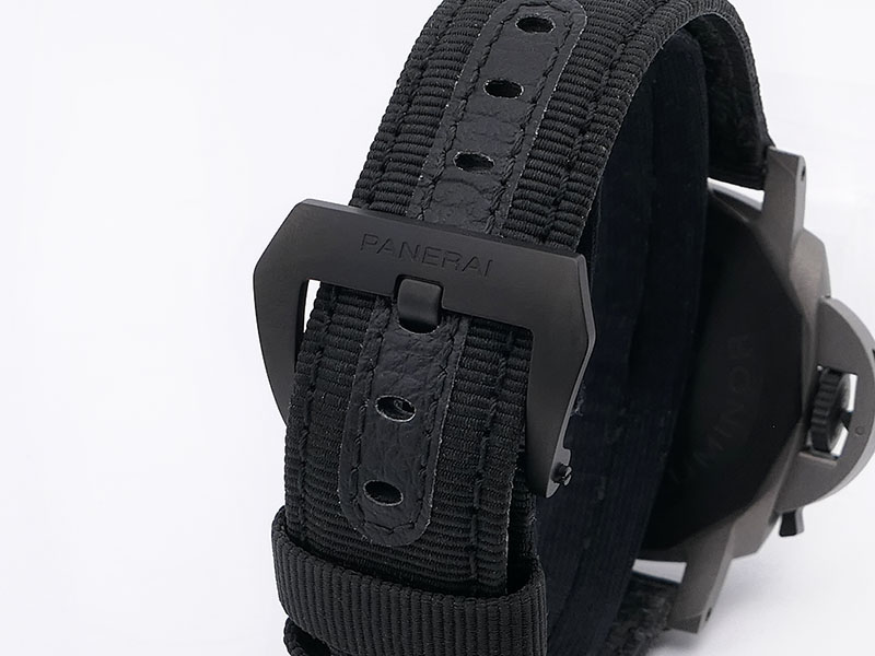 Panerai’s trapezoidal buckle, made of black DLC-coated titanium, whose