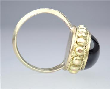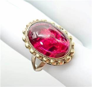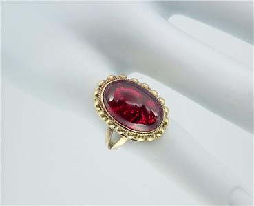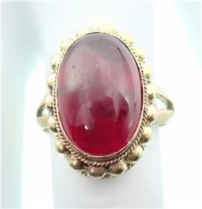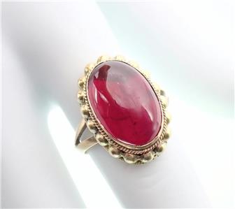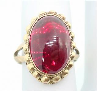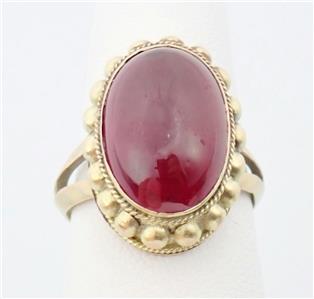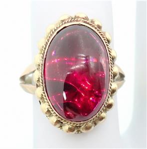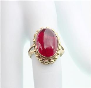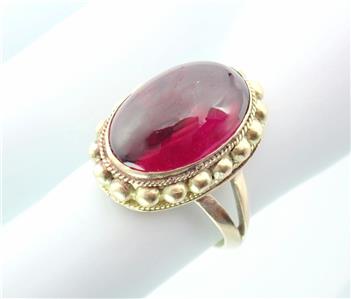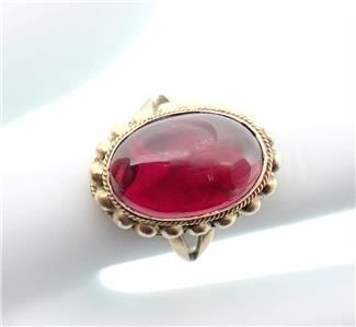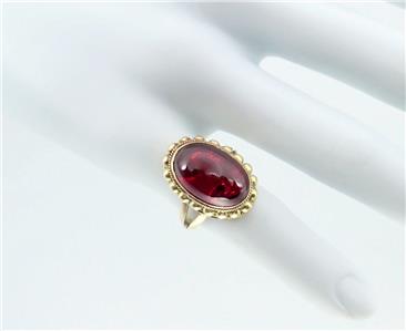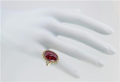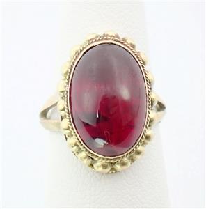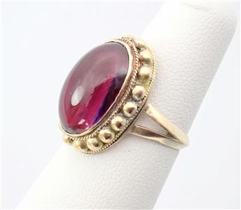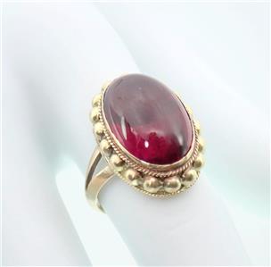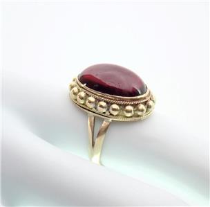This spectacular antique Victorian Etruscan cocktail ring has a solid 13k yellow gold head and a solid 11k yellow gold band, the ring with the most incredible large sized bezel-set, foil-backed natural garnet cabochon which glows a super intense bright cherry red when it touches the light, the garnet with a halo of fabulous gold beads surrounding it which are set inside lovely gold rope twist frames, the ring with split shoulders and a knife edge band-a stunning ring designed to be noticed! The ring is unmarked, the head XRF tests for 13k gold and the band for 11k gold.