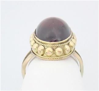 A gorgeous antique Victorian Etruscan revival solid 13k and 11k gold large sized cabochon garnet ring, dating to circa 1880.