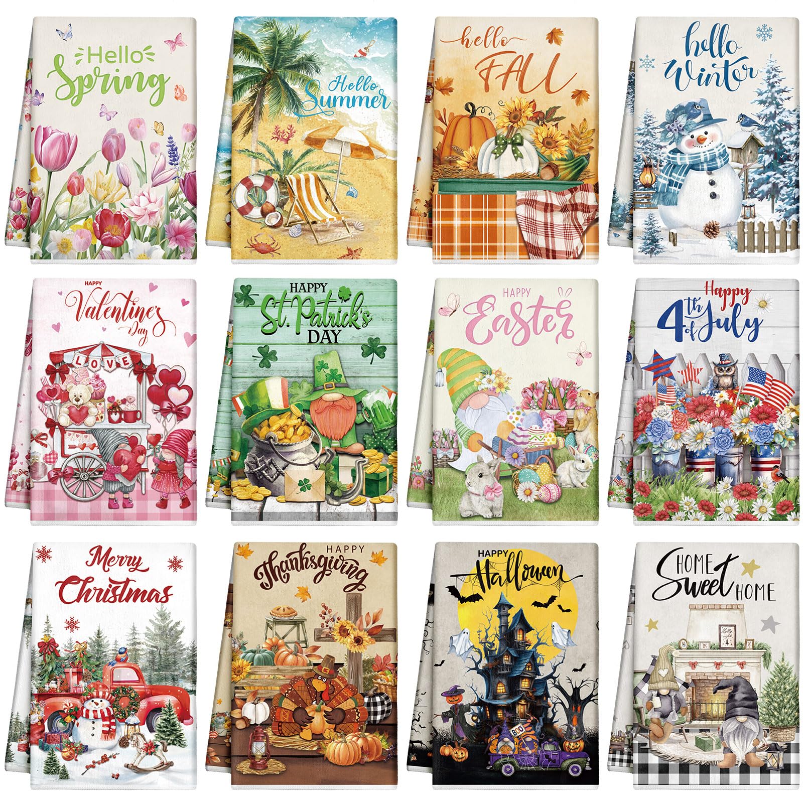 12 Pcs Seasonal Kitchen Towels Set for All Holidays Hand Dish Tea Towels Fall Halloween Christmas Cute Drying Dishcloths Decorative Absorbent Wash Cloths(Fresh Style)