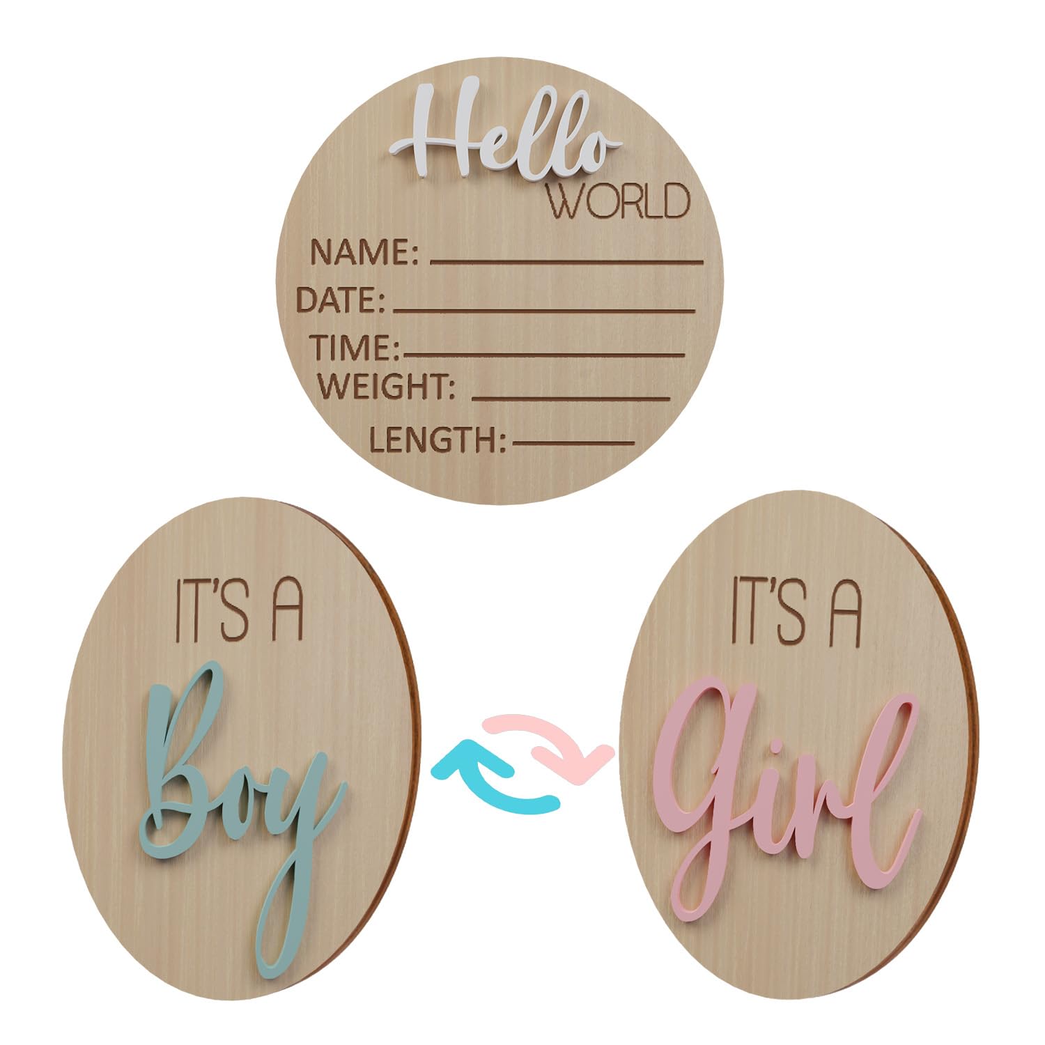 - ELEGANT BABY ANNOUNCEMENT SIGN: Elevate your baby's nursery décor with our stunning 3D "It's a Boy/Girl" and "Hello World" wooden signs. Measuring 20 cm in diameter, these signs add a touch of sophistication to the room and create a memorable announcement.