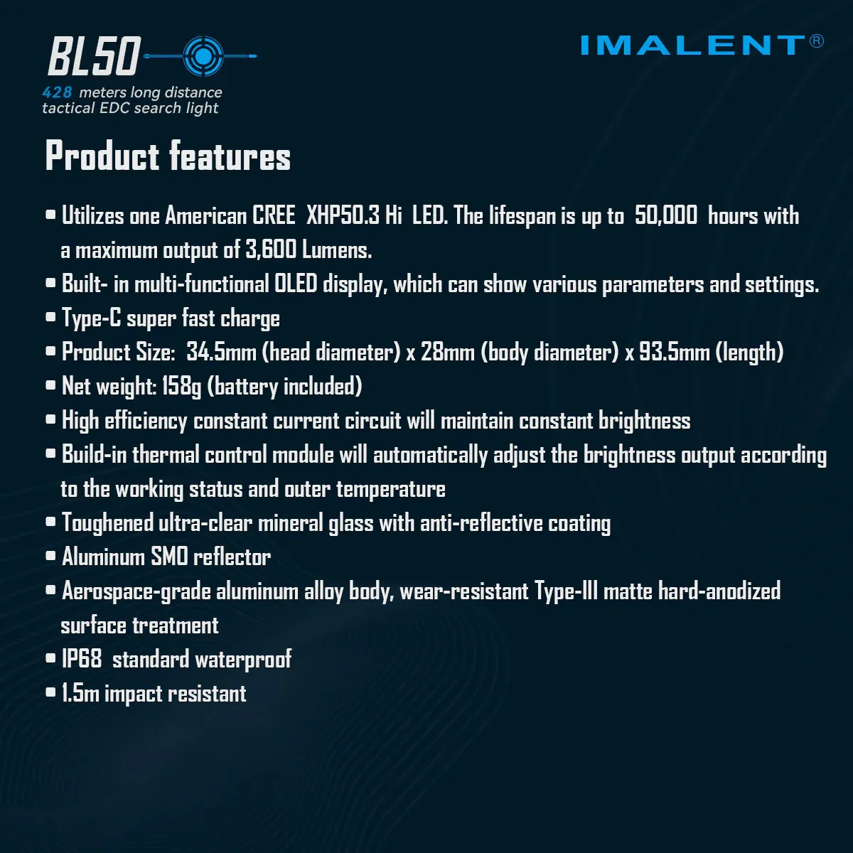 The IMALENT BL50 goes beyond ordinary flashlights. With up to 50,000 hours of life, Type-C ultra-fast charging, and rugged aircraft-grade construction, it's the most reliable EDC flashlight. The smart OLED display adds a touch of sophistication, making it a must-have accessory for those who demand performance and innovation from their devices.